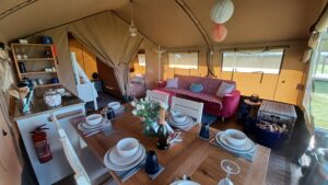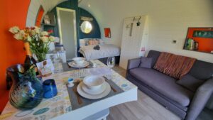 - Luxury glamping pod – complete with electricity, private shower, and toilet