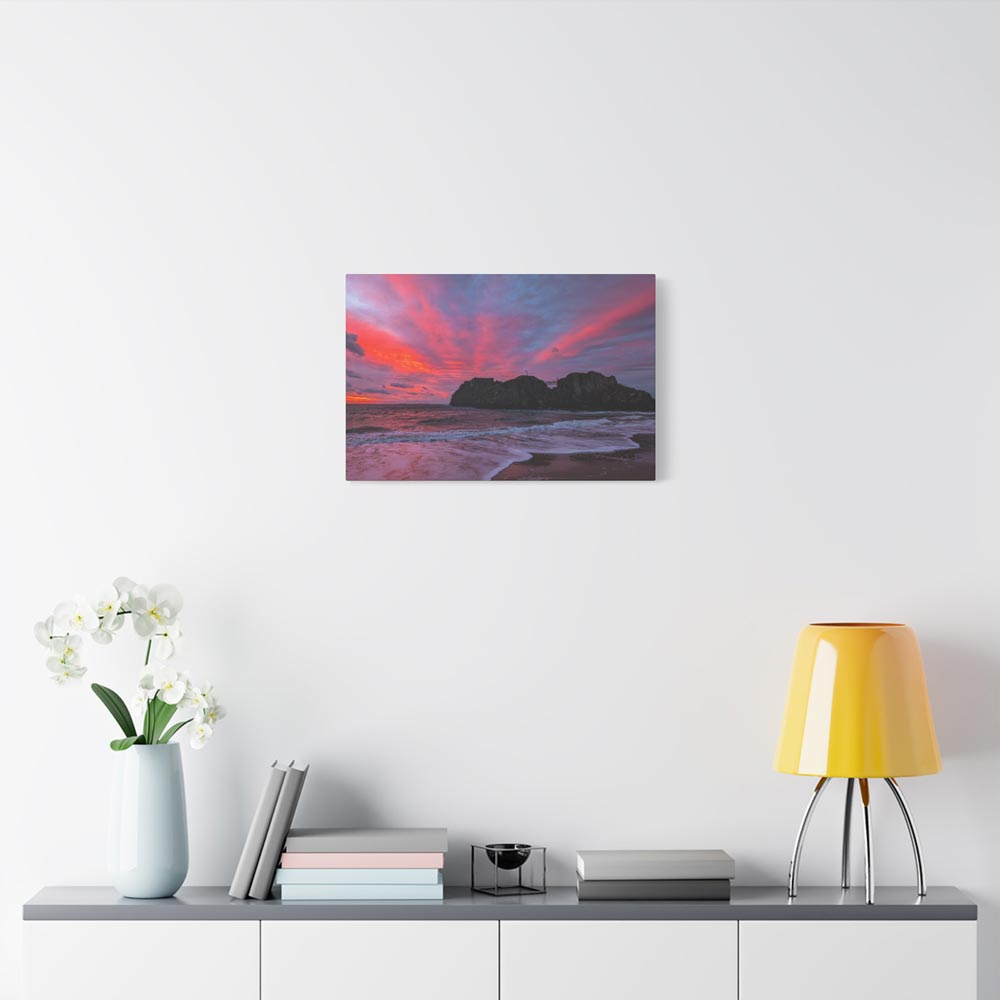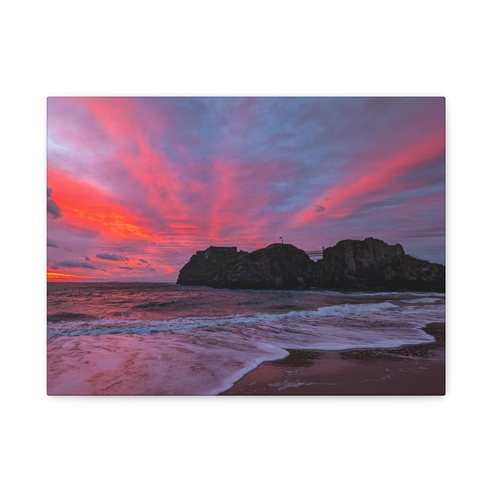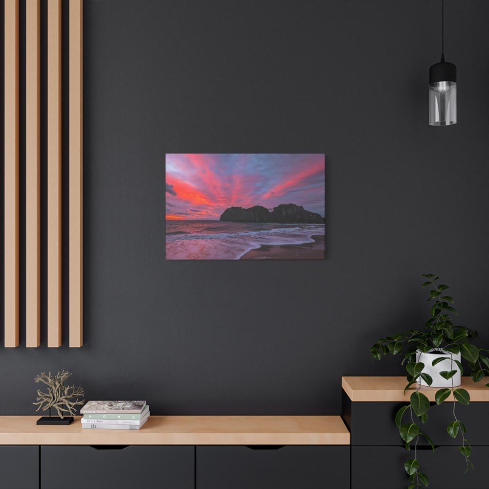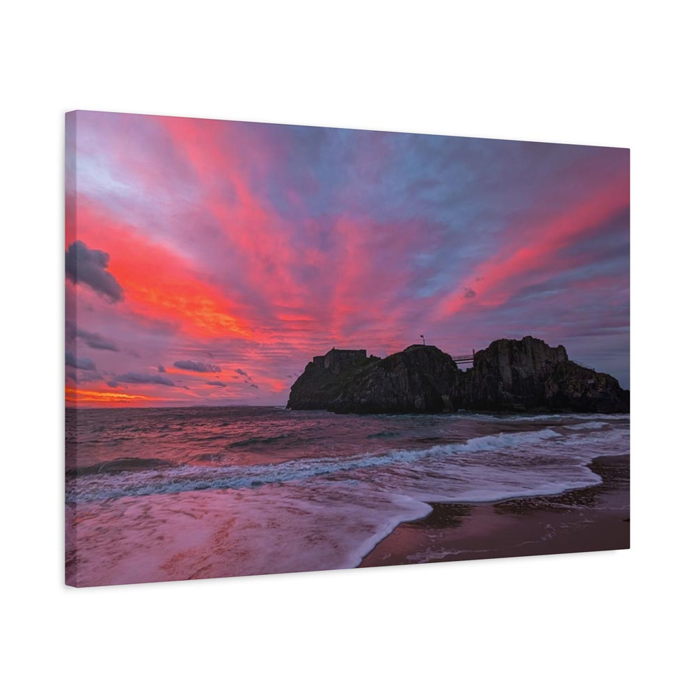 Bring home “Flaming Skies Over St Catherine’s Island,” a mesmerising canvas print by Lucy Crockford that captures the iconic island under a spectacular pink and red sunset. Available in three sizes – 16″x12″, 24″x16″, and 30″x20″ – each canvas arrives ready to hang with a solid, sustainably sourced pine frame.