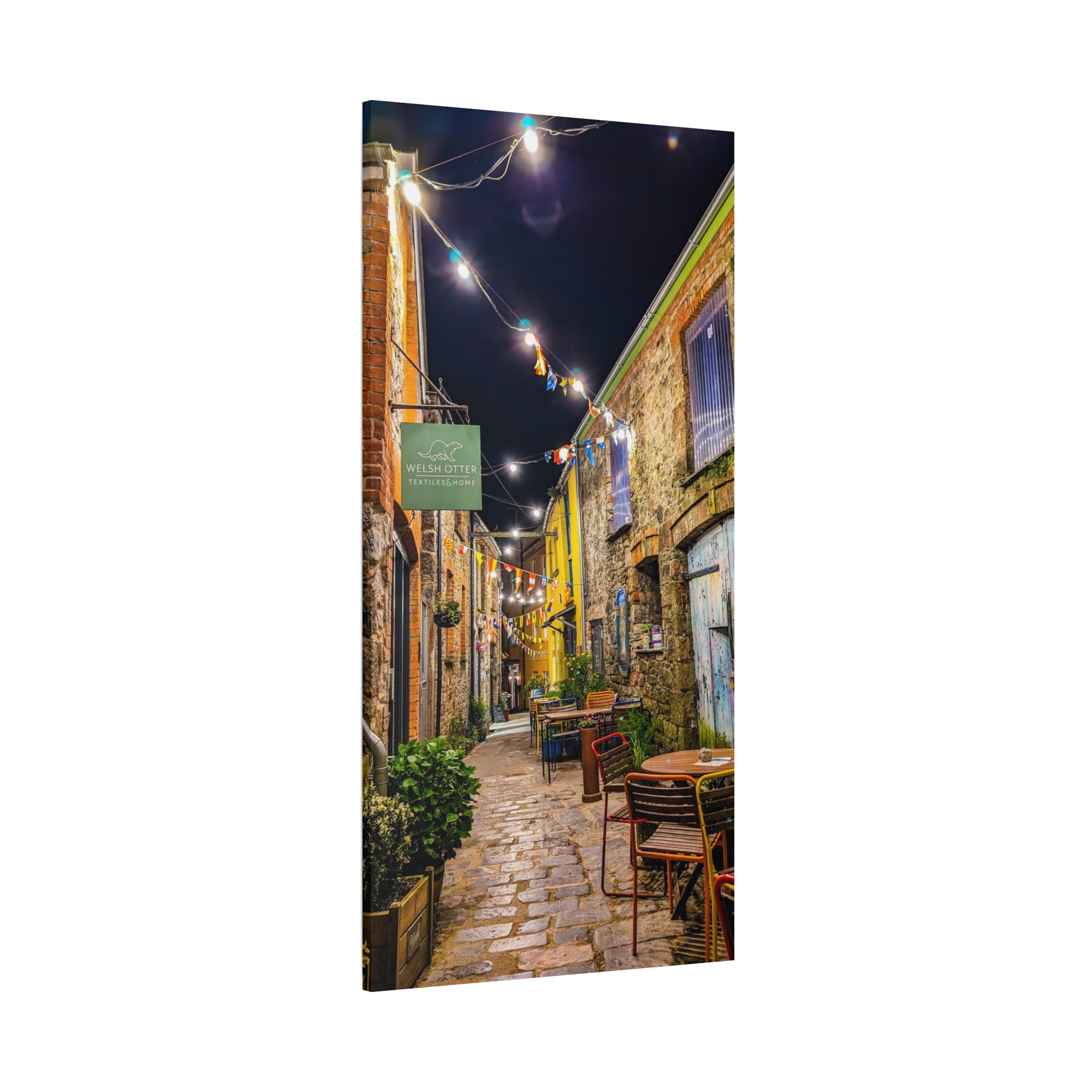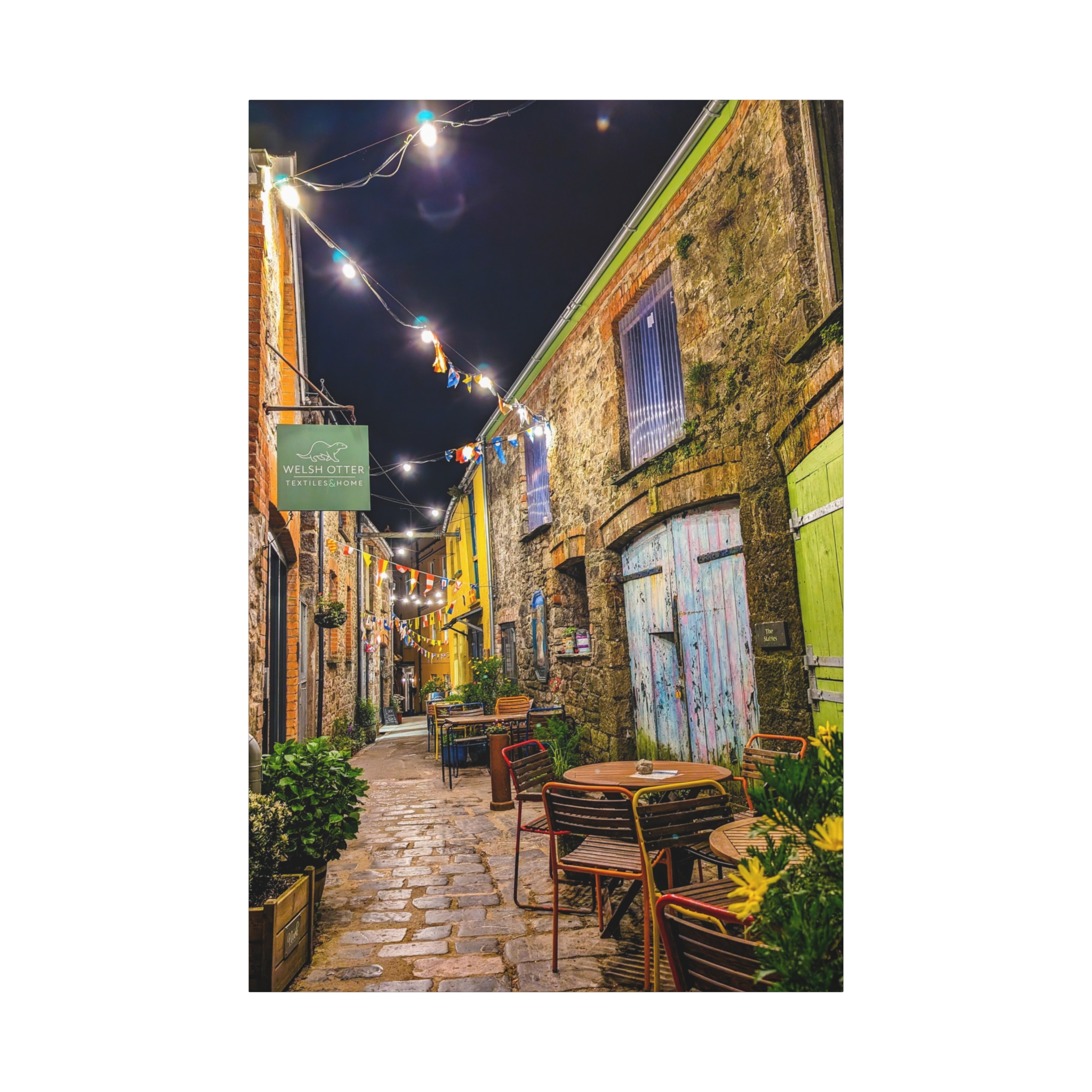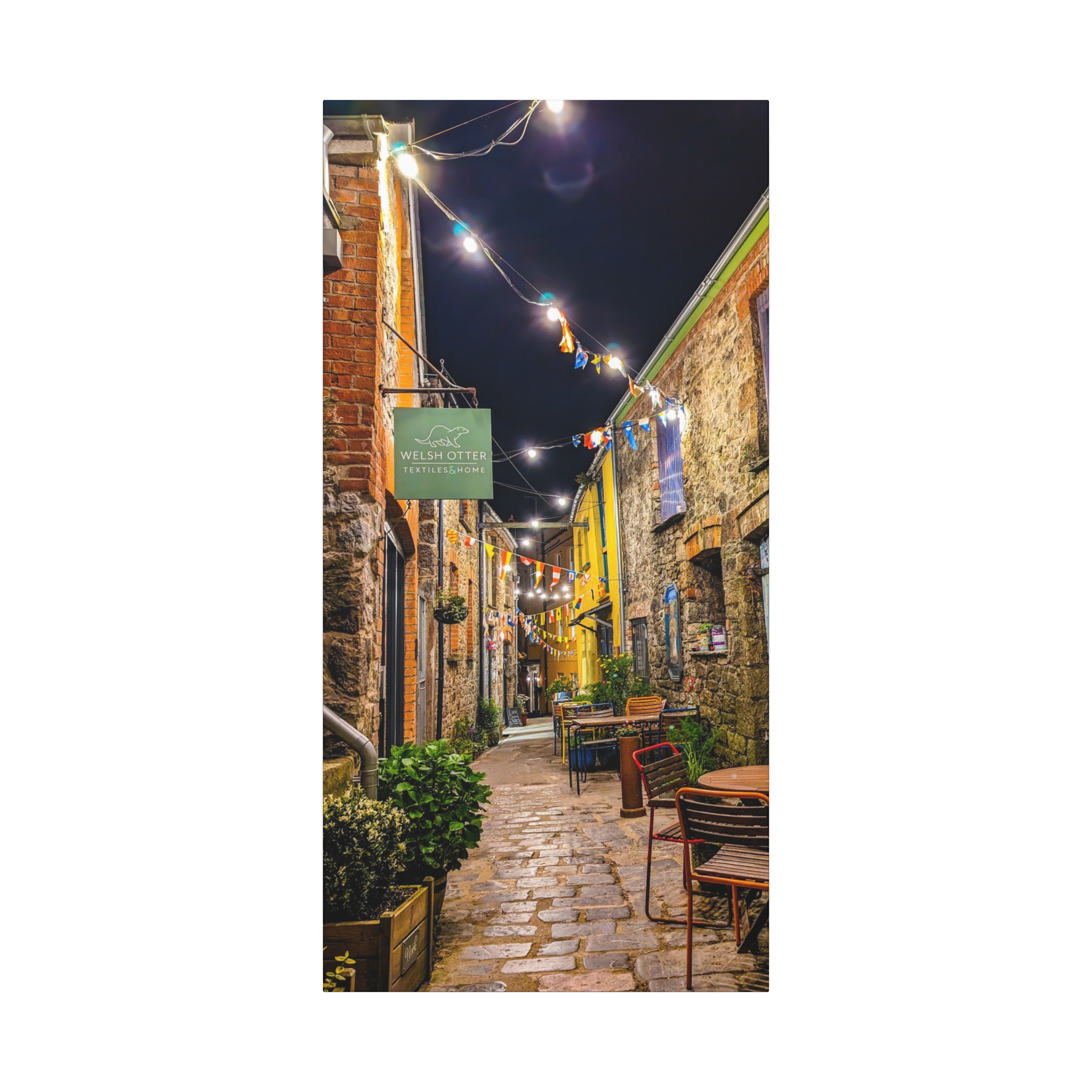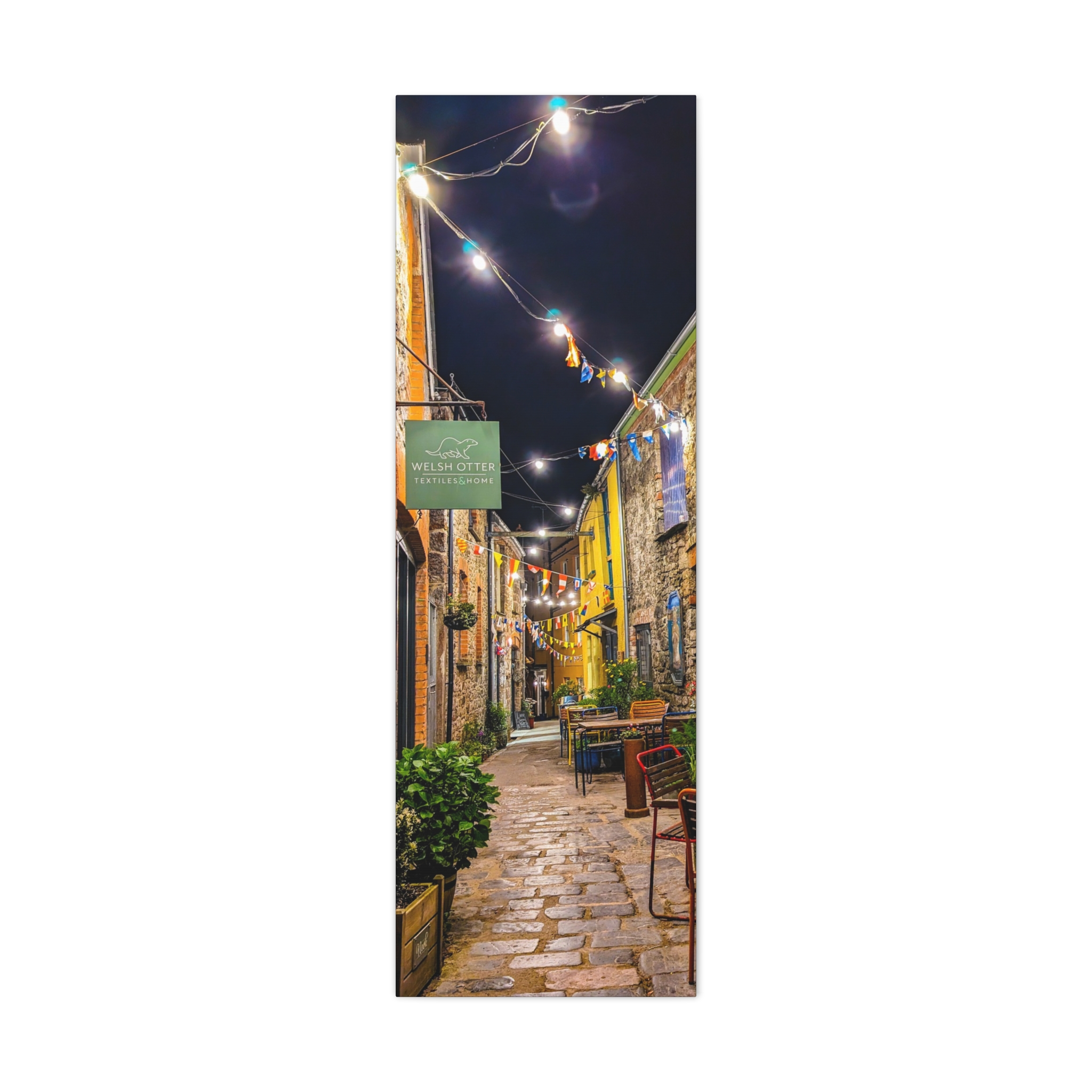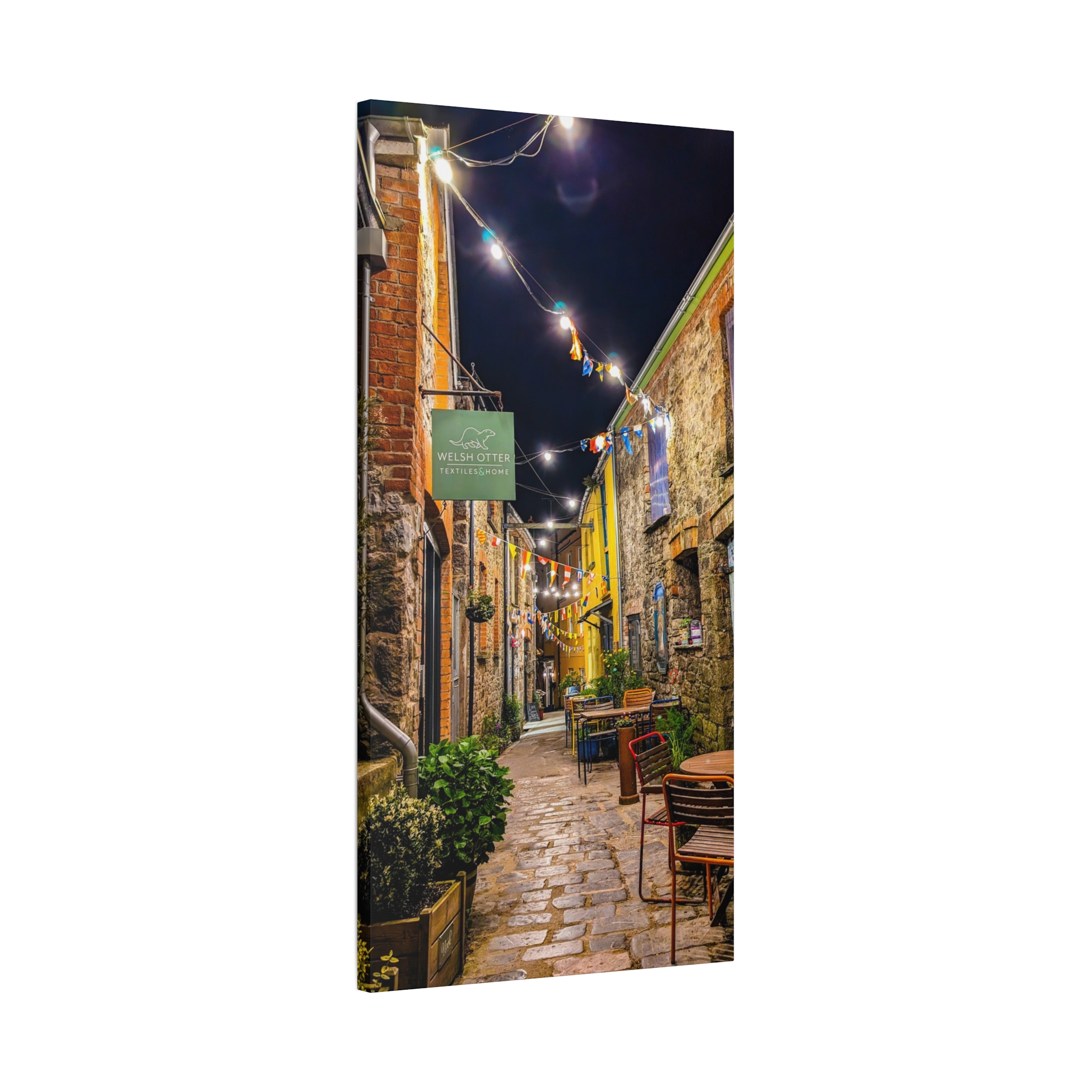 Step into the heart of Tenby with this breathtaking canvas print of Sergeant’s Lane, masterfully captured by local artist Lucy Crockford. This vibrant scene, illuminated by twinkling lights and colourful bunting, brings to life the rustic charm of one of Tenby’s most iconic lanes. Perfect for anyone who loves the magic of an evening stroll through Tenby’s winding alleys.