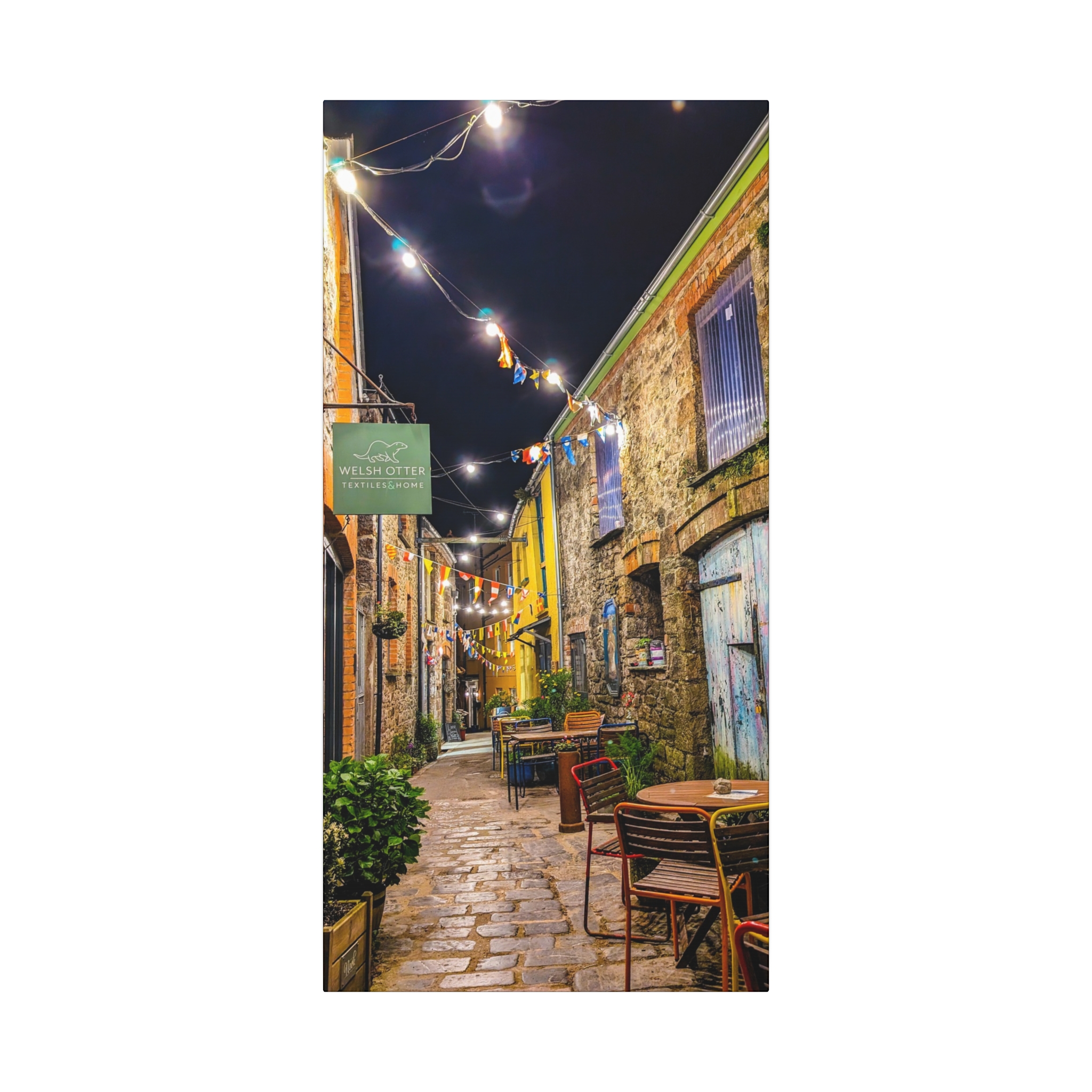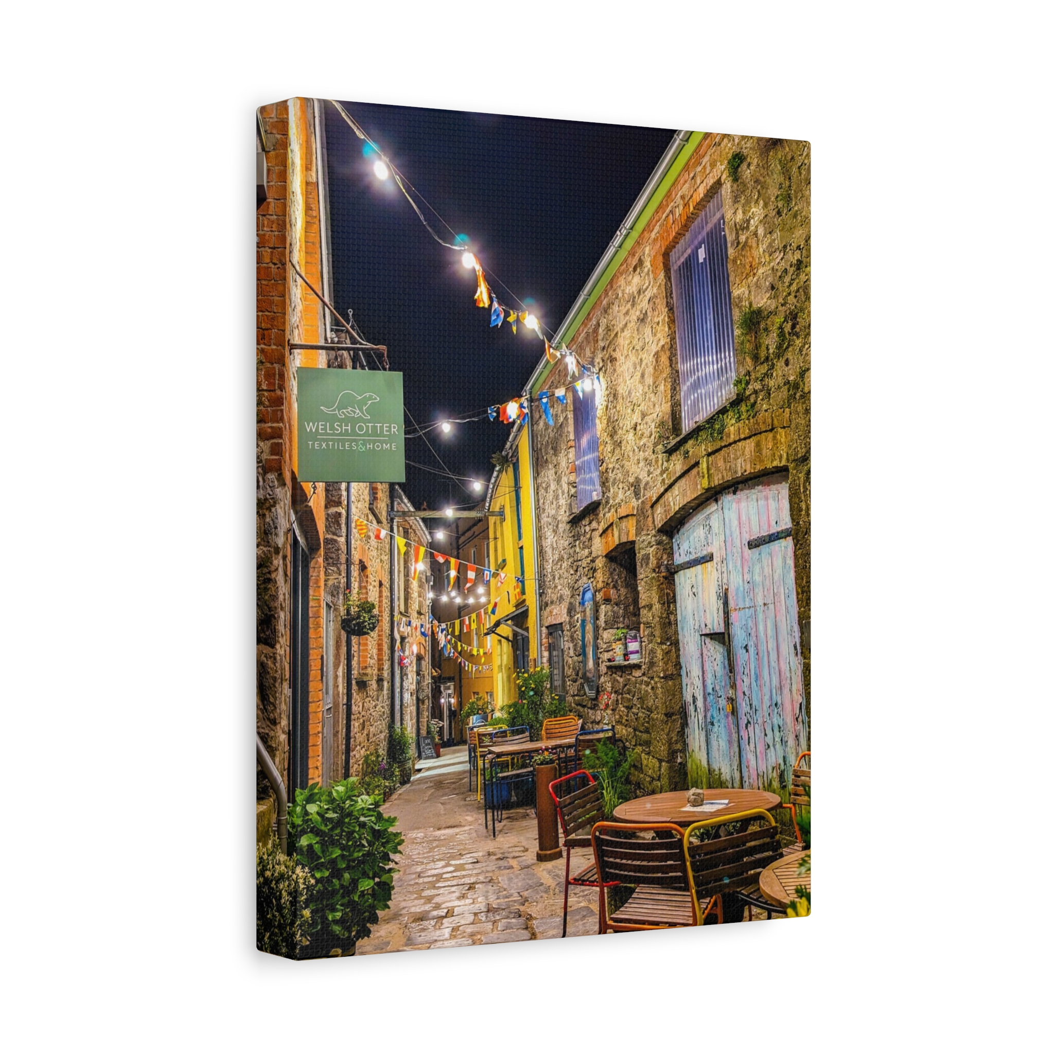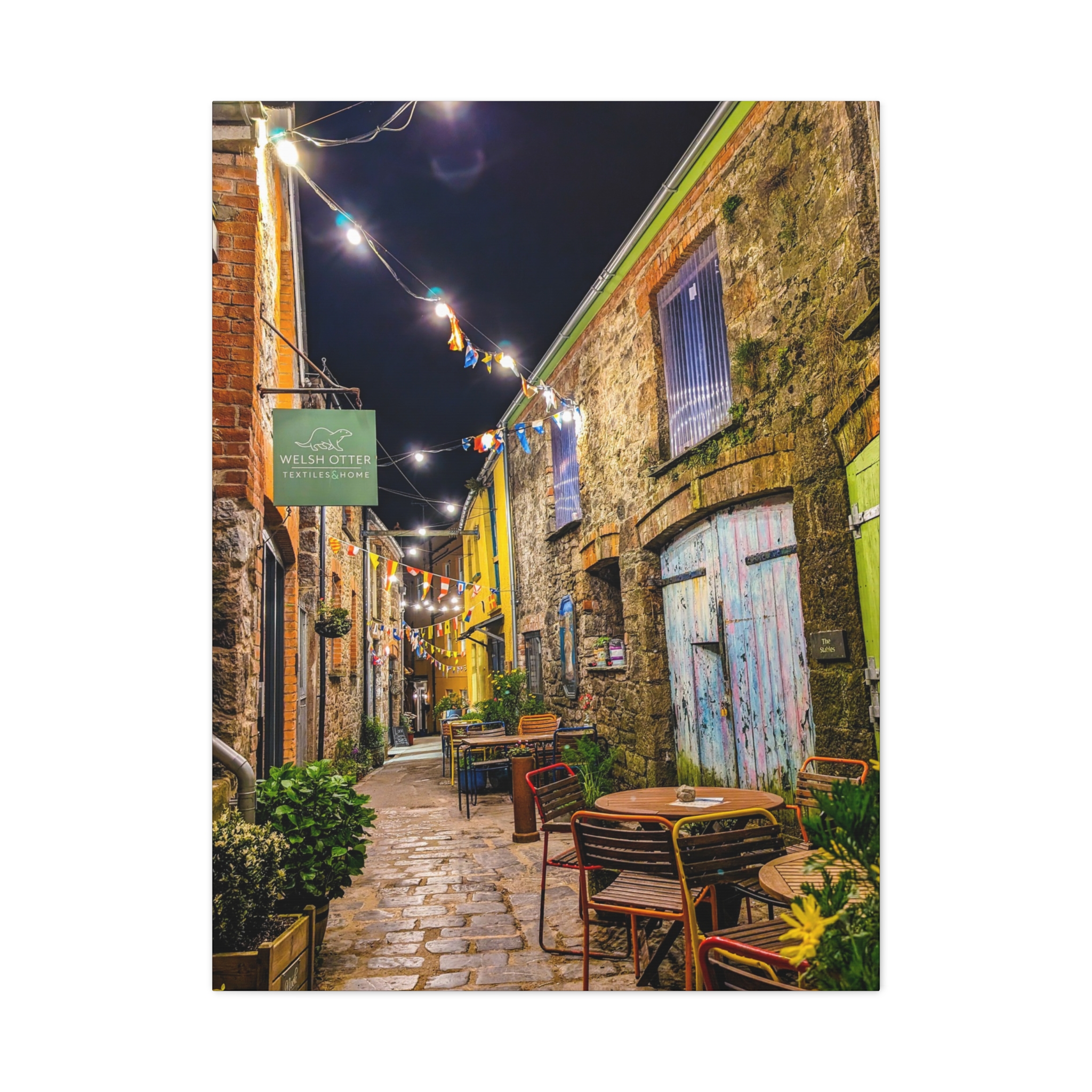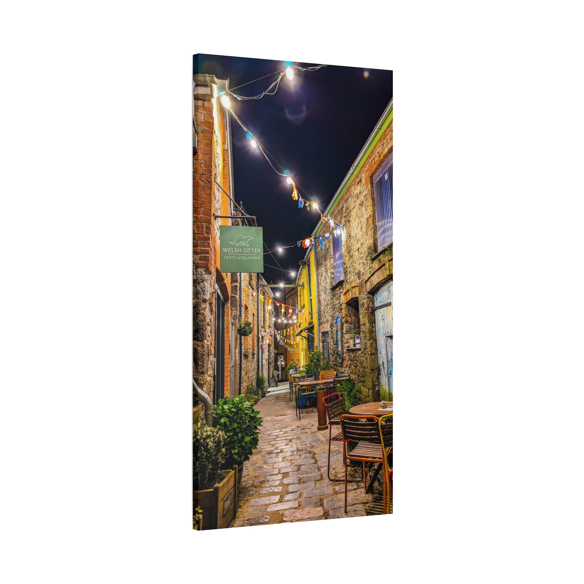 Step into the heart of Tenby with this breathtaking canvas print of Sergeant’s Lane, masterfully captured by local artist Lucy Crockford. This vibrant scene, illuminated by twinkling lights and colourful bunting, brings to life the rustic charm of one of Tenby’s most iconic lanes. Perfect for anyone who loves the magic of an evening stroll through Tenby’s winding alleys.