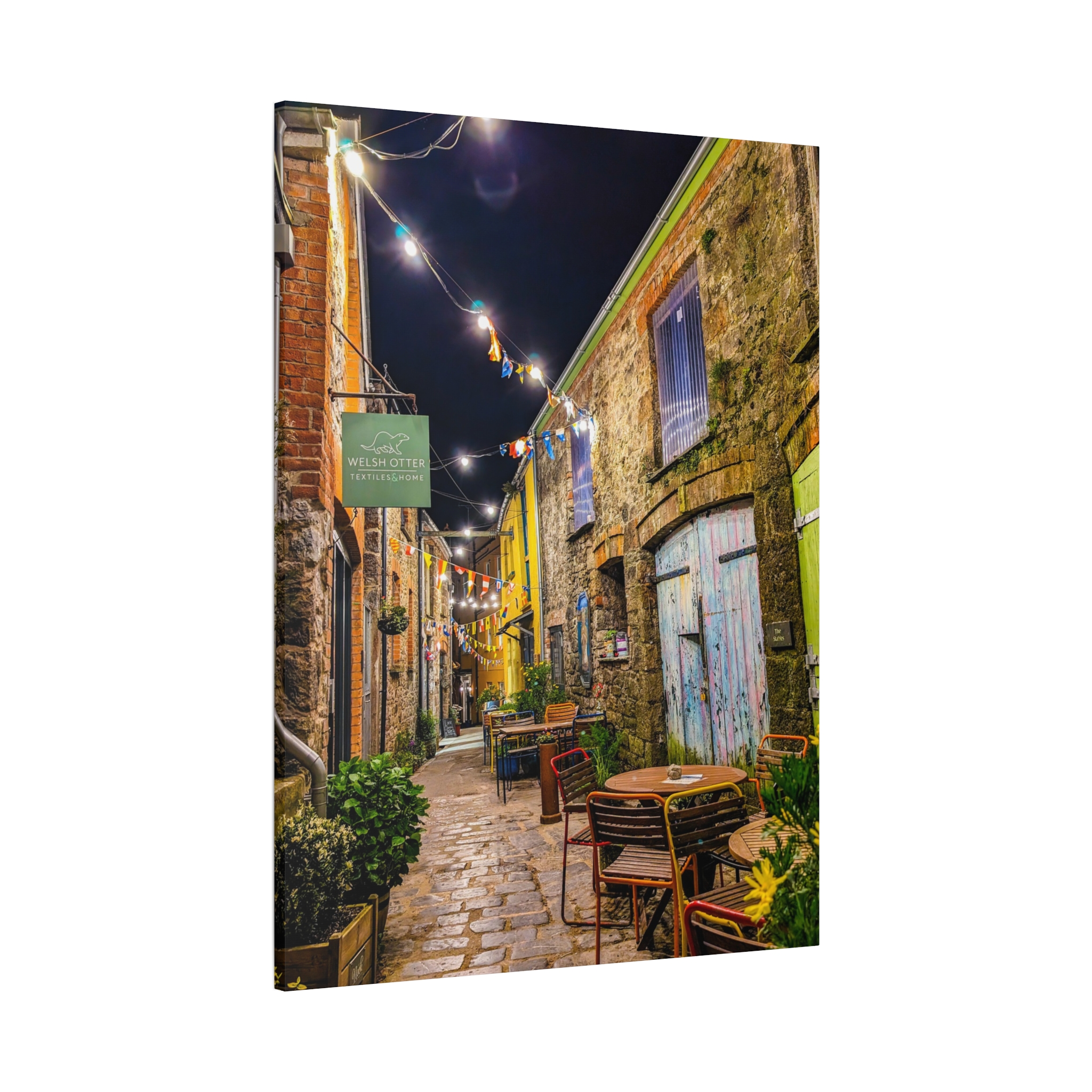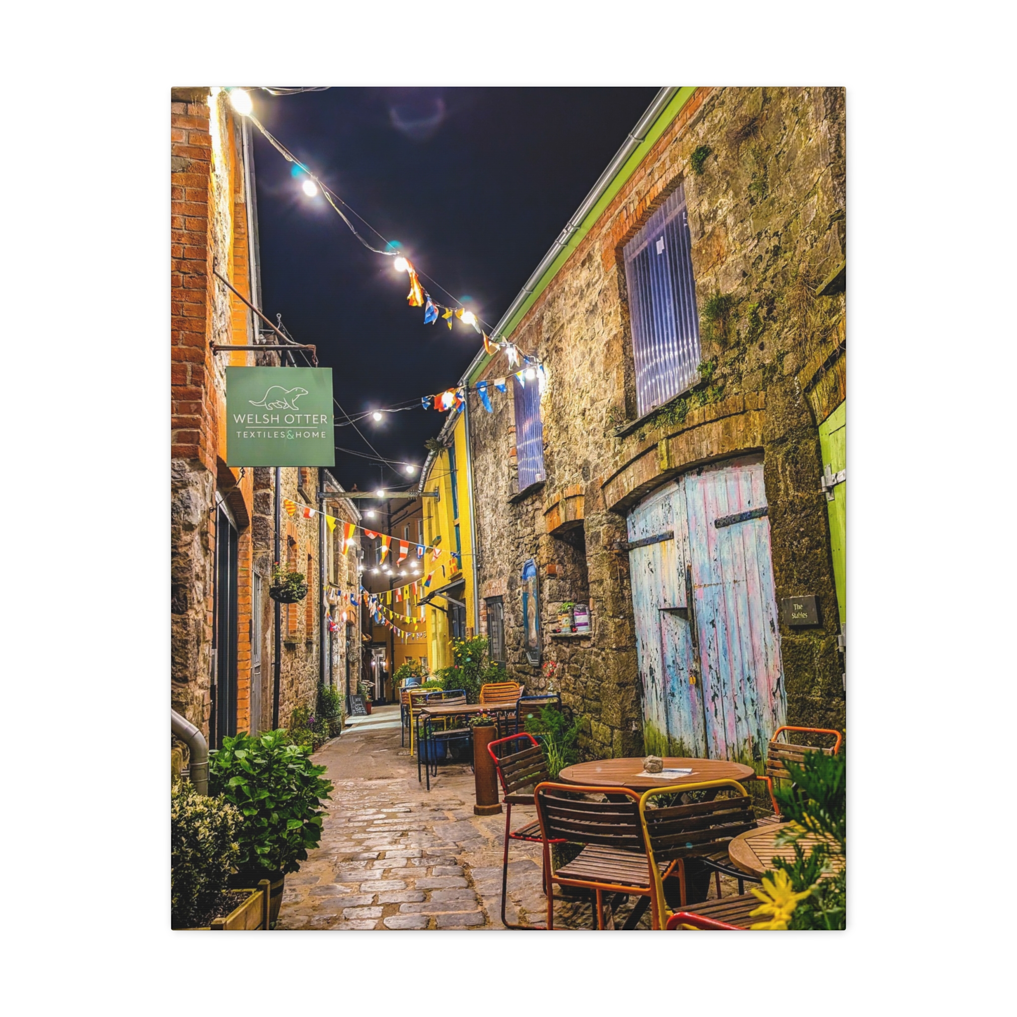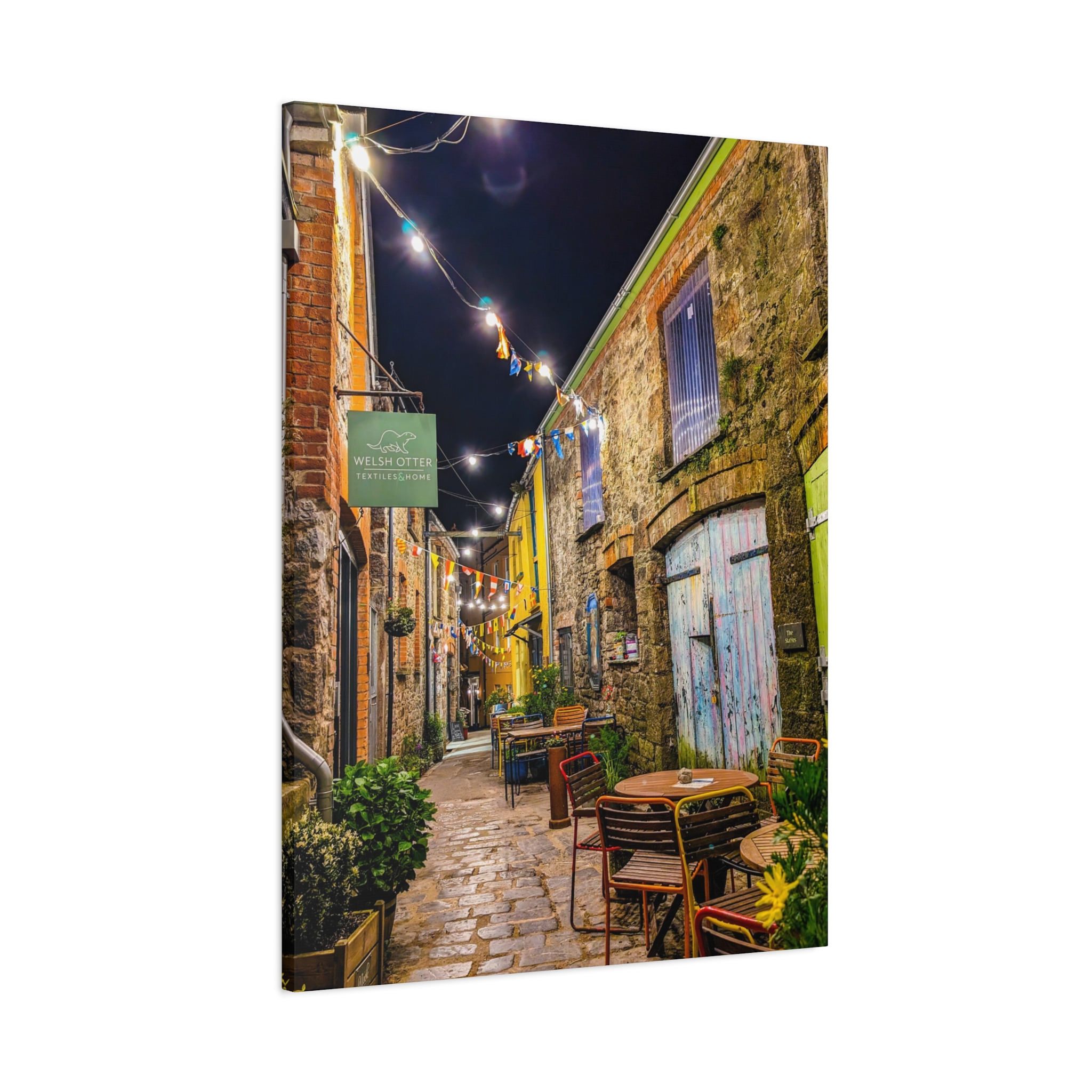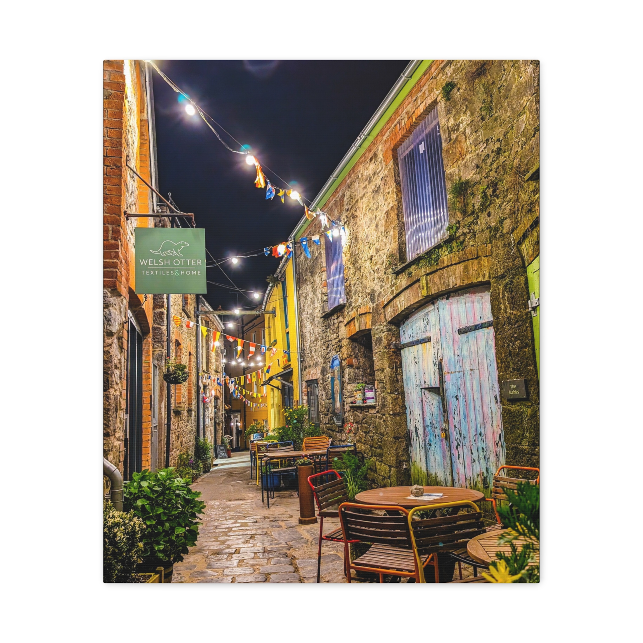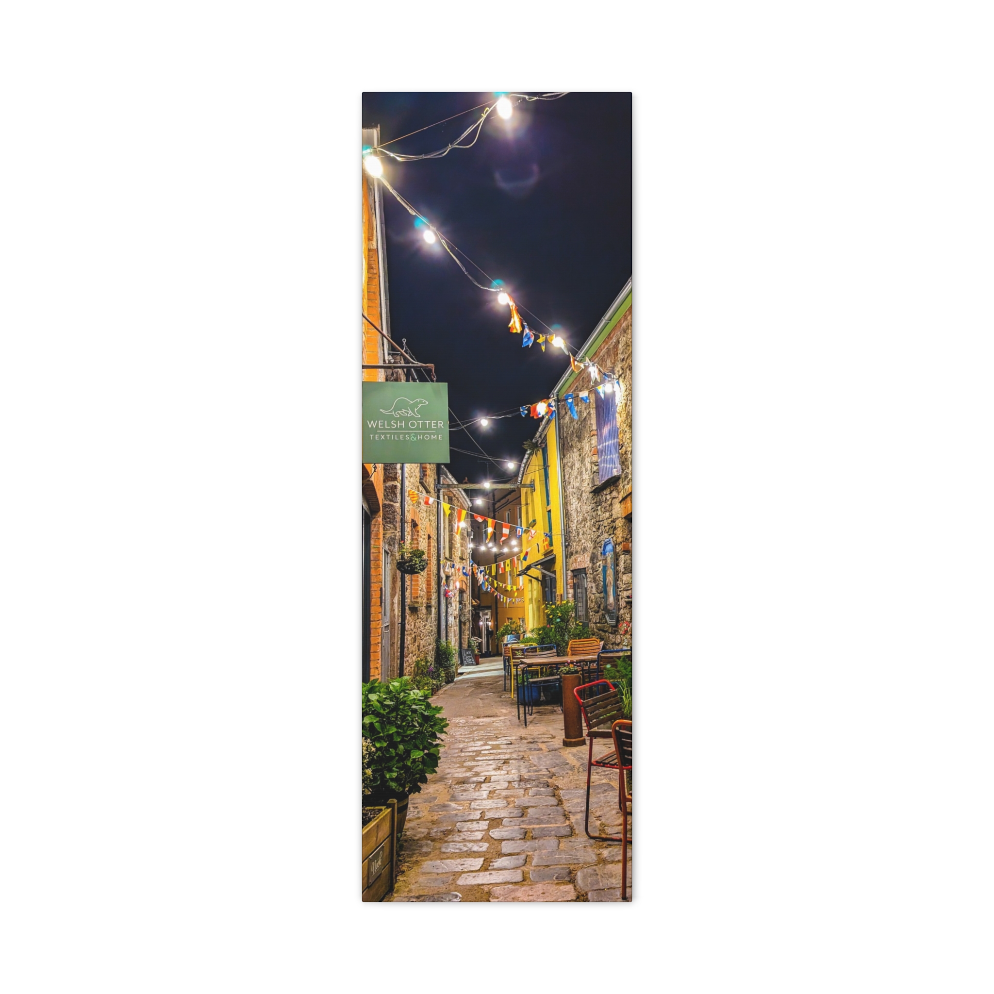 Step into the heart of Tenby with this breathtaking canvas print of Sergeant’s Lane, masterfully captured by local artist Lucy Crockford. This vibrant scene, illuminated by twinkling lights and colourful bunting, brings to life the rustic charm of one of Tenby’s most iconic lanes. Perfect for anyone who loves the magic of an evening stroll through Tenby’s winding alleys.