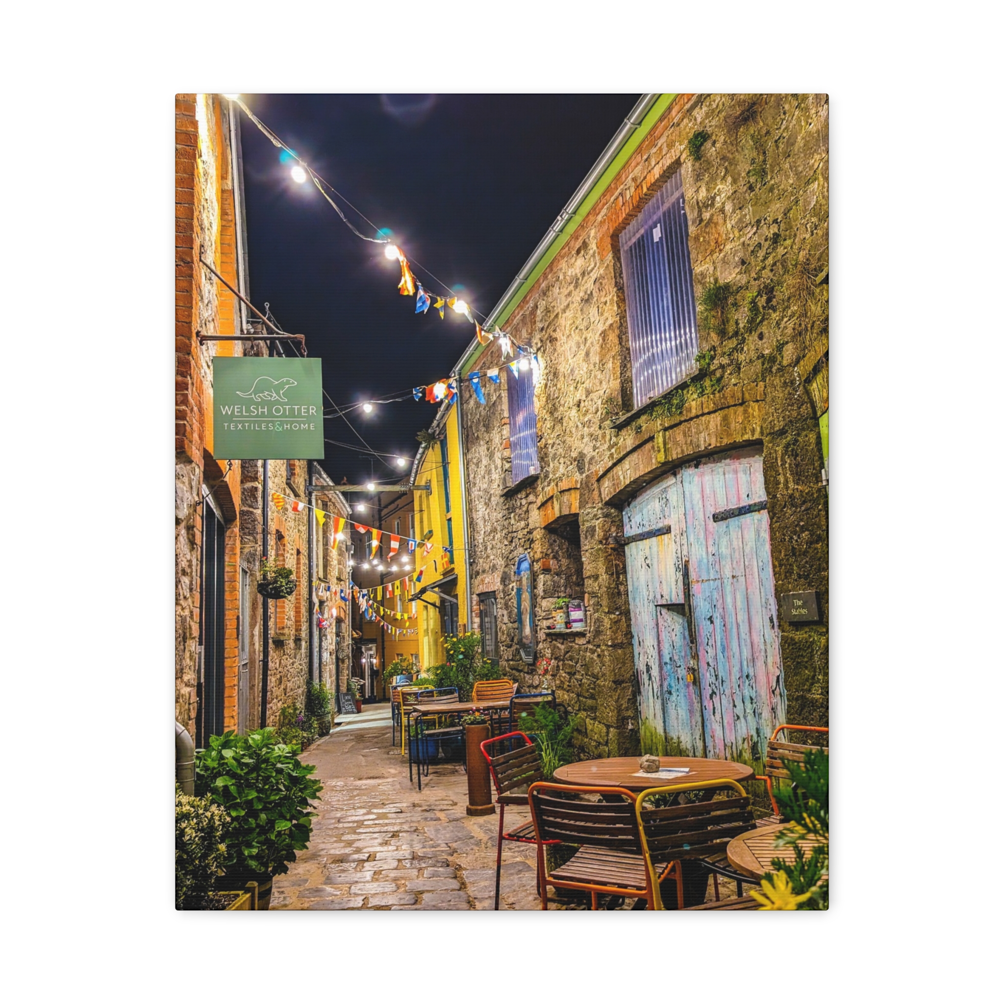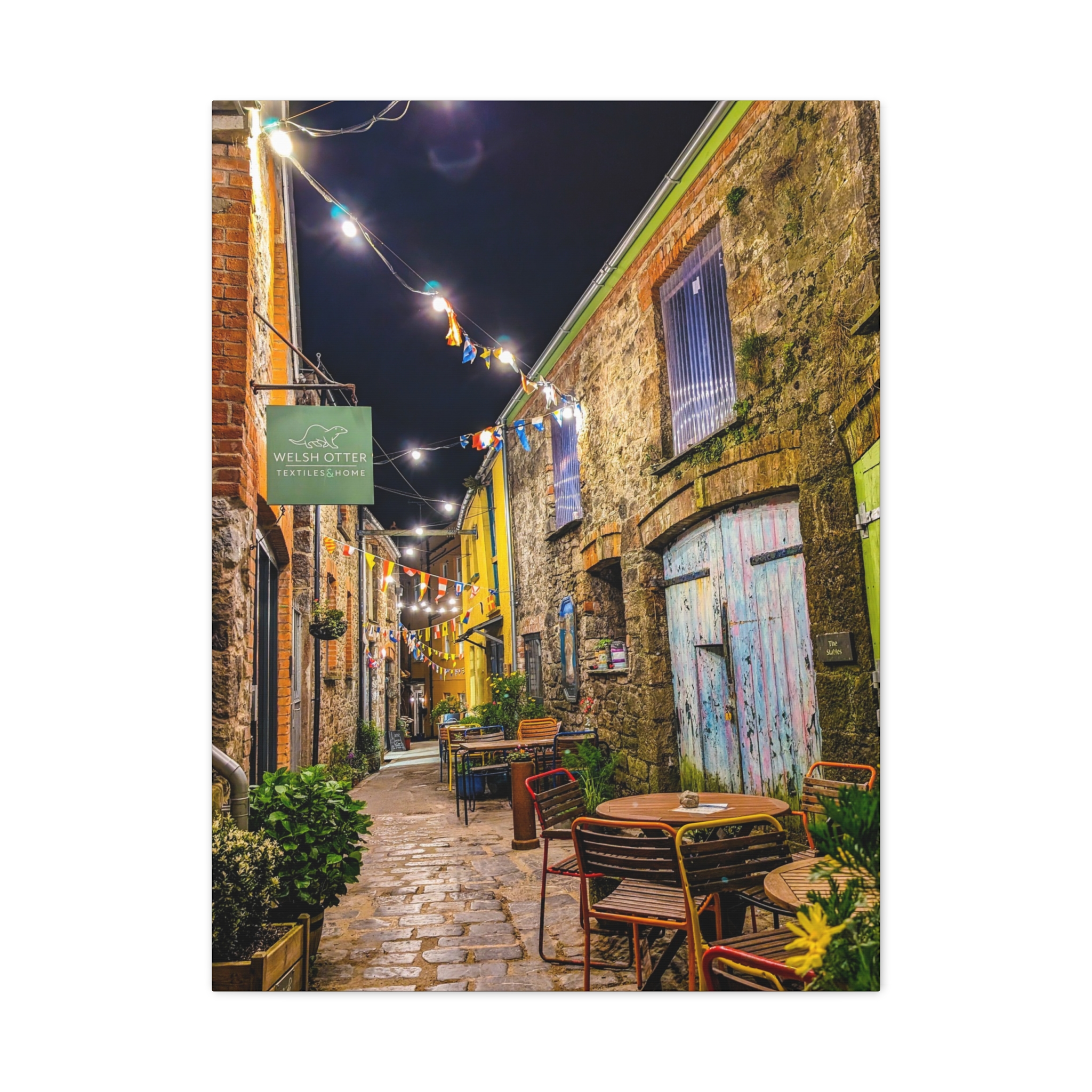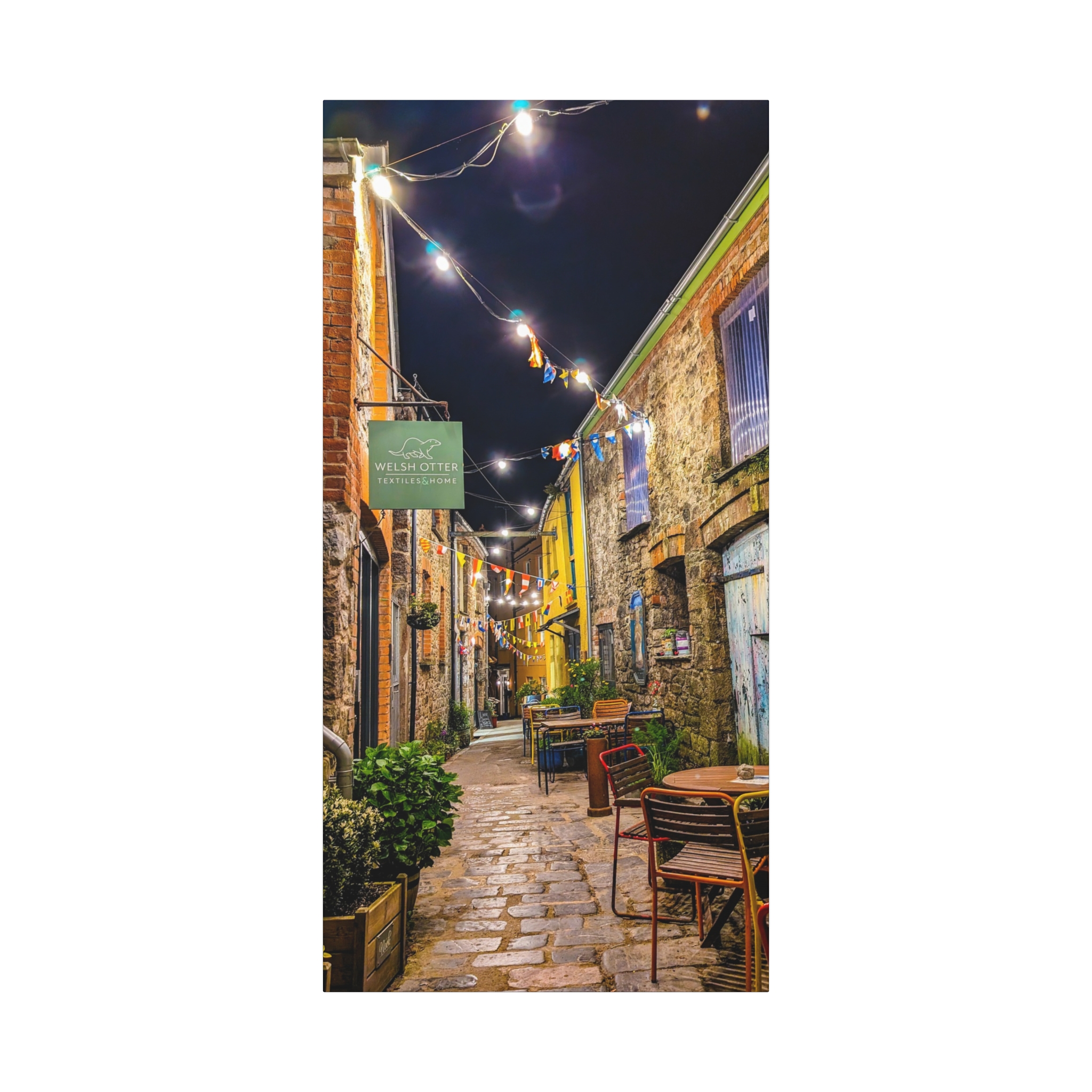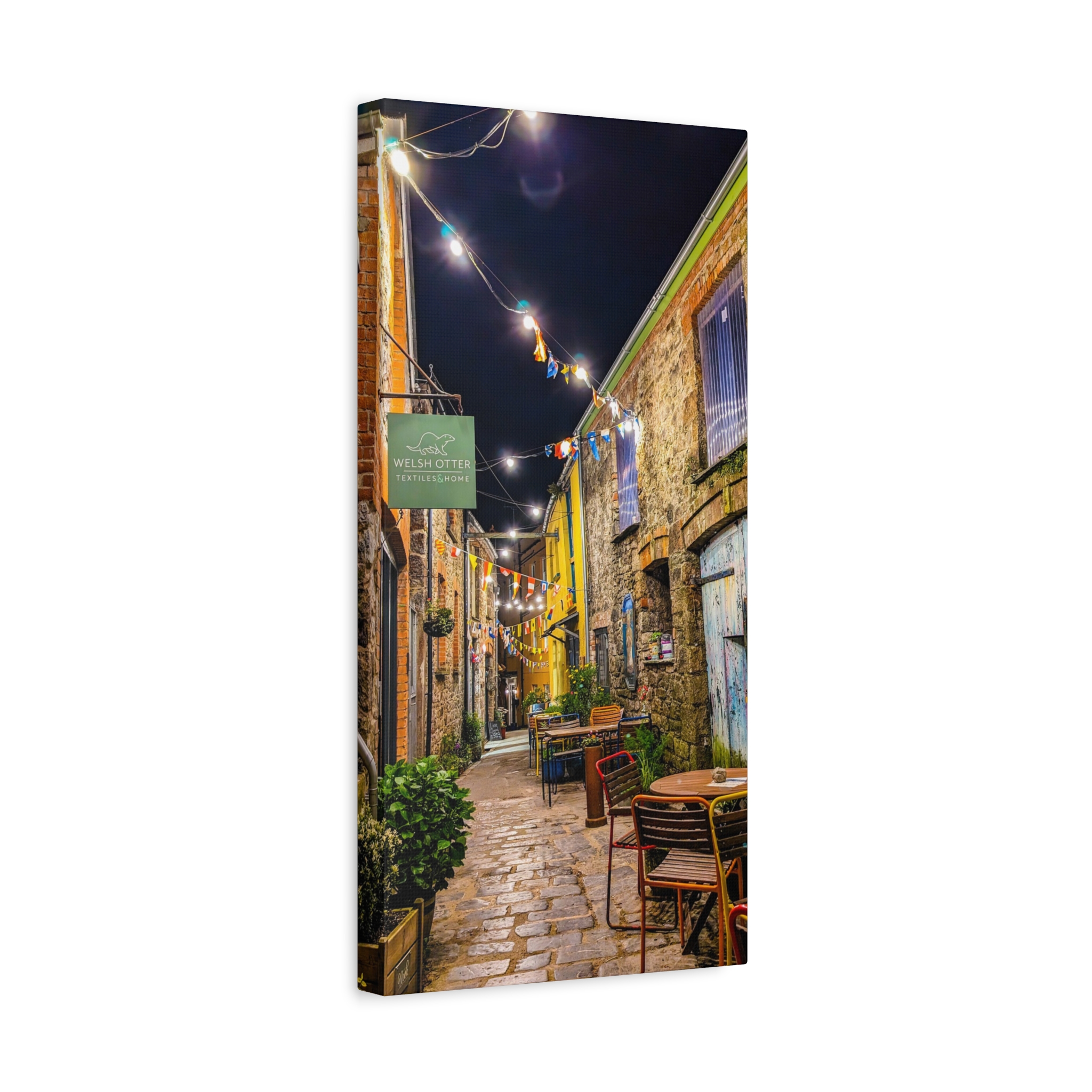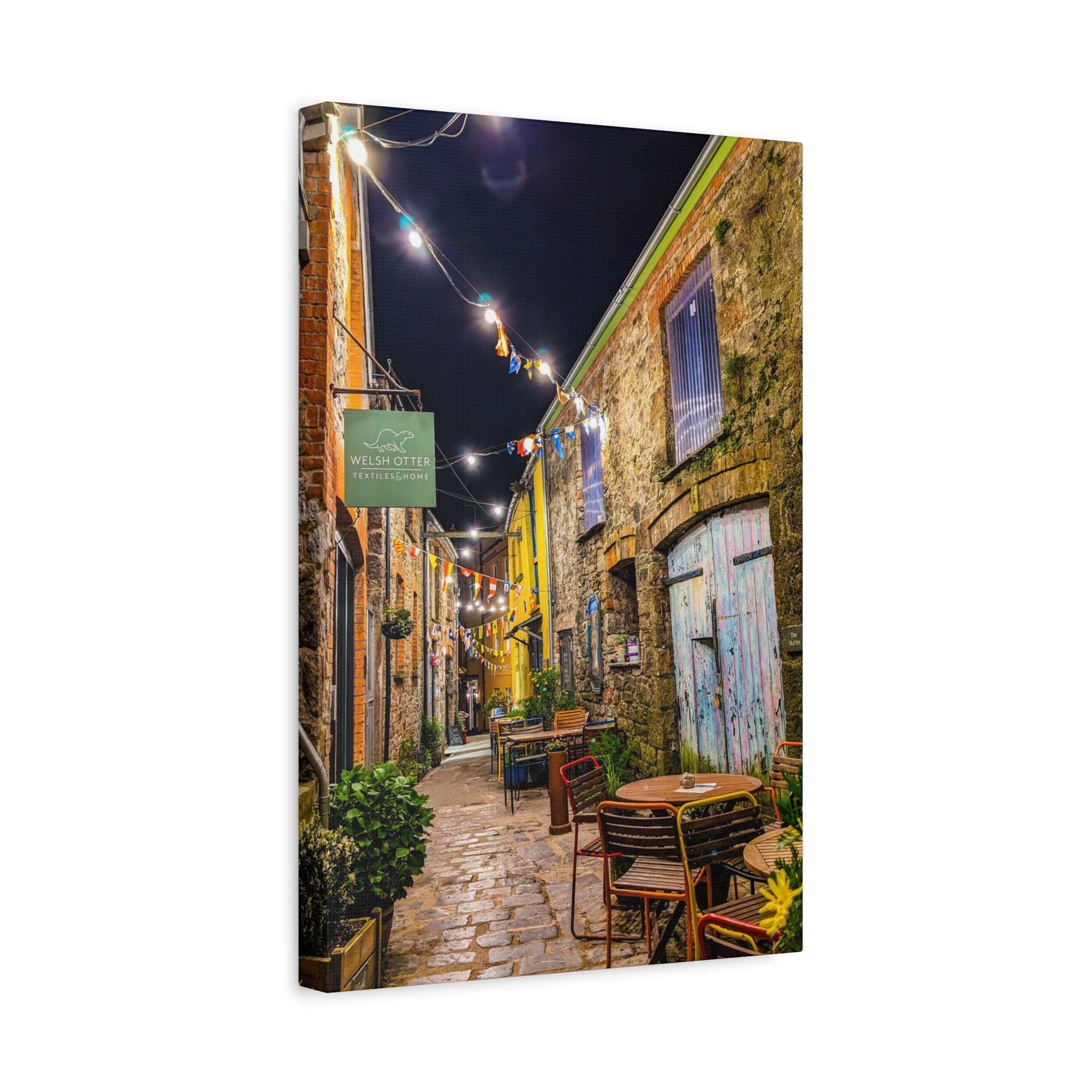 Step into the heart of Tenby with this breathtaking canvas print of Sergeant’s Lane, masterfully captured by local artist Lucy Crockford. This vibrant scene, illuminated by twinkling lights and colourful bunting, brings to life the rustic charm of one of Tenby’s most iconic lanes. Perfect for anyone who loves the magic of an evening stroll through Tenby’s winding alleys.