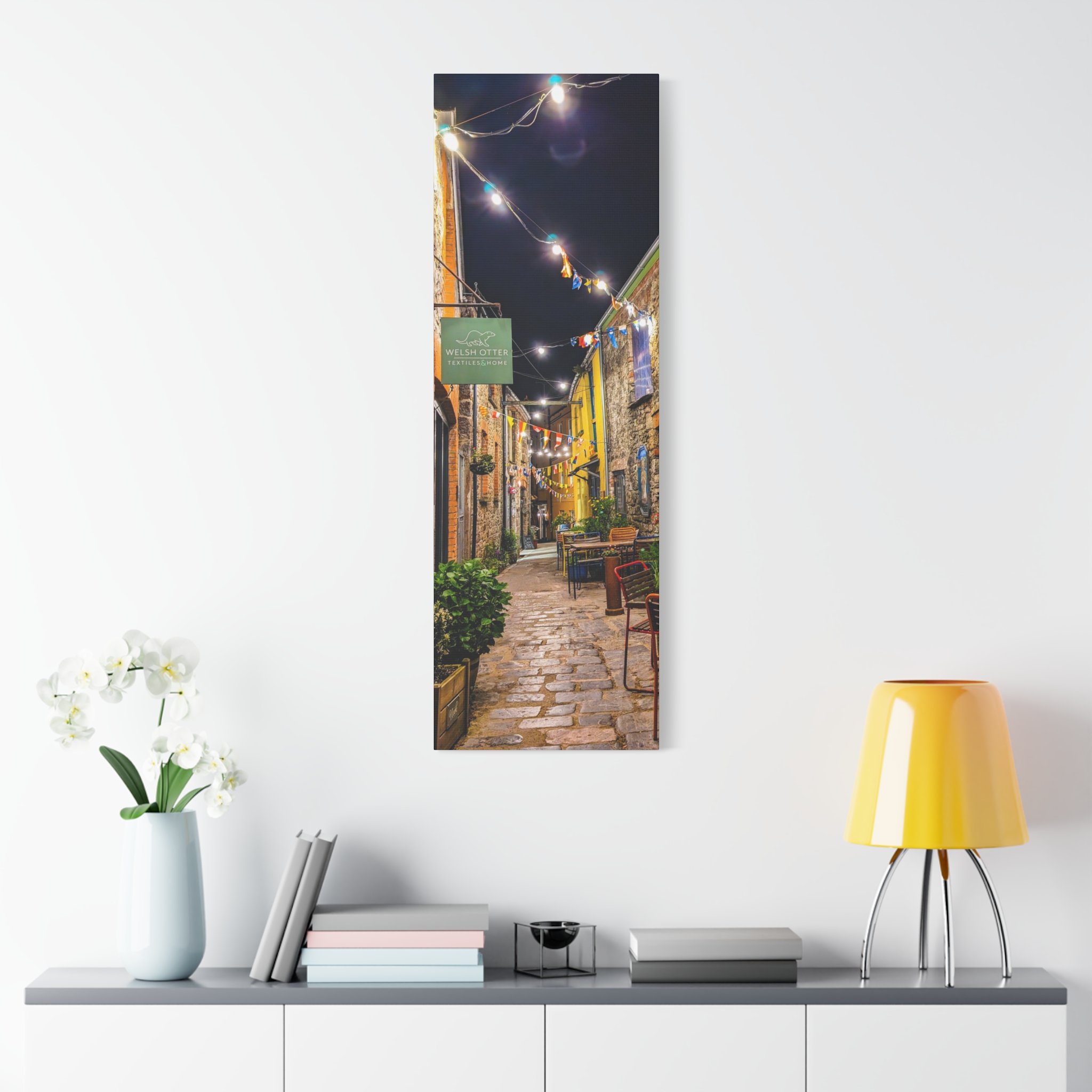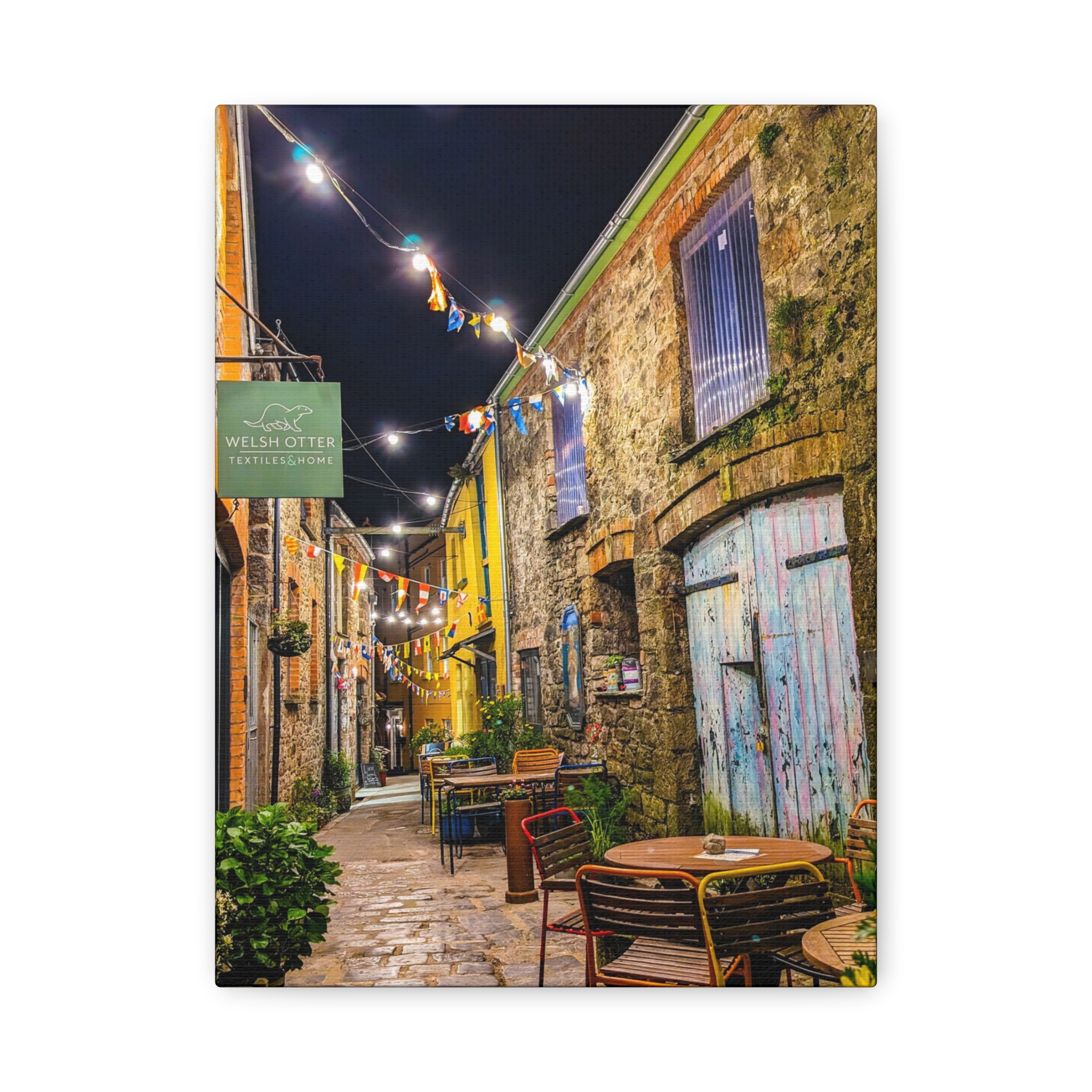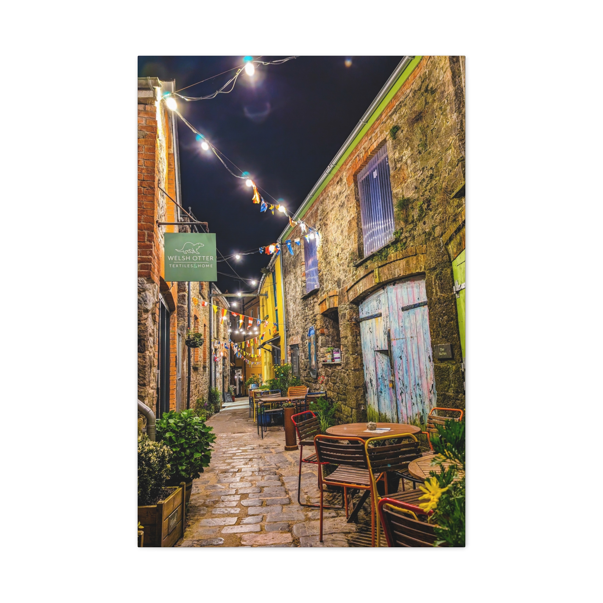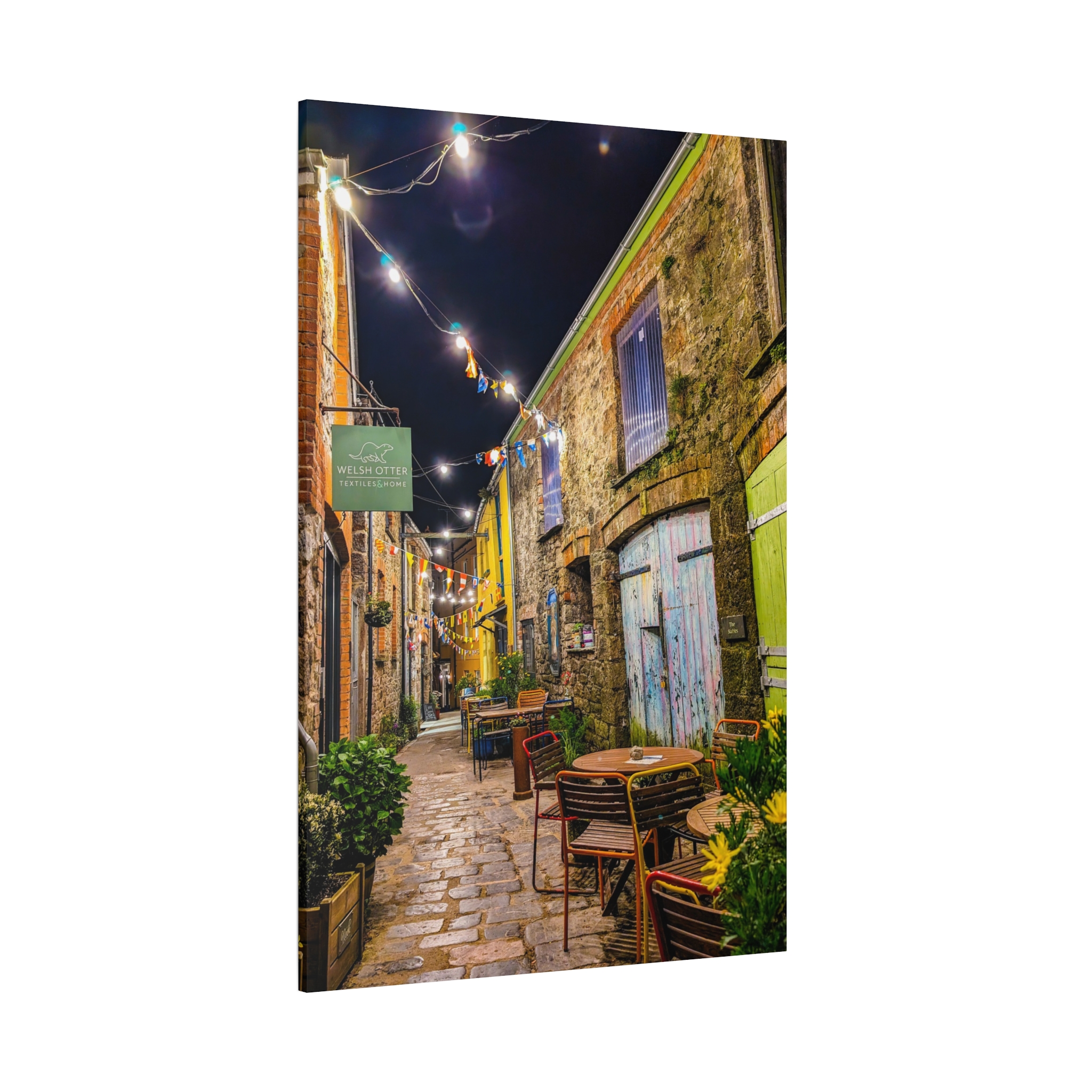 Step into the heart of Tenby with this breathtaking canvas print of Sergeant’s Lane, masterfully captured by local artist Lucy Crockford. This vibrant scene, illuminated by twinkling lights and colourful bunting, brings to life the rustic charm of one of Tenby’s most iconic lanes. Perfect for anyone who loves the magic of an evening stroll through Tenby’s winding alleys.
