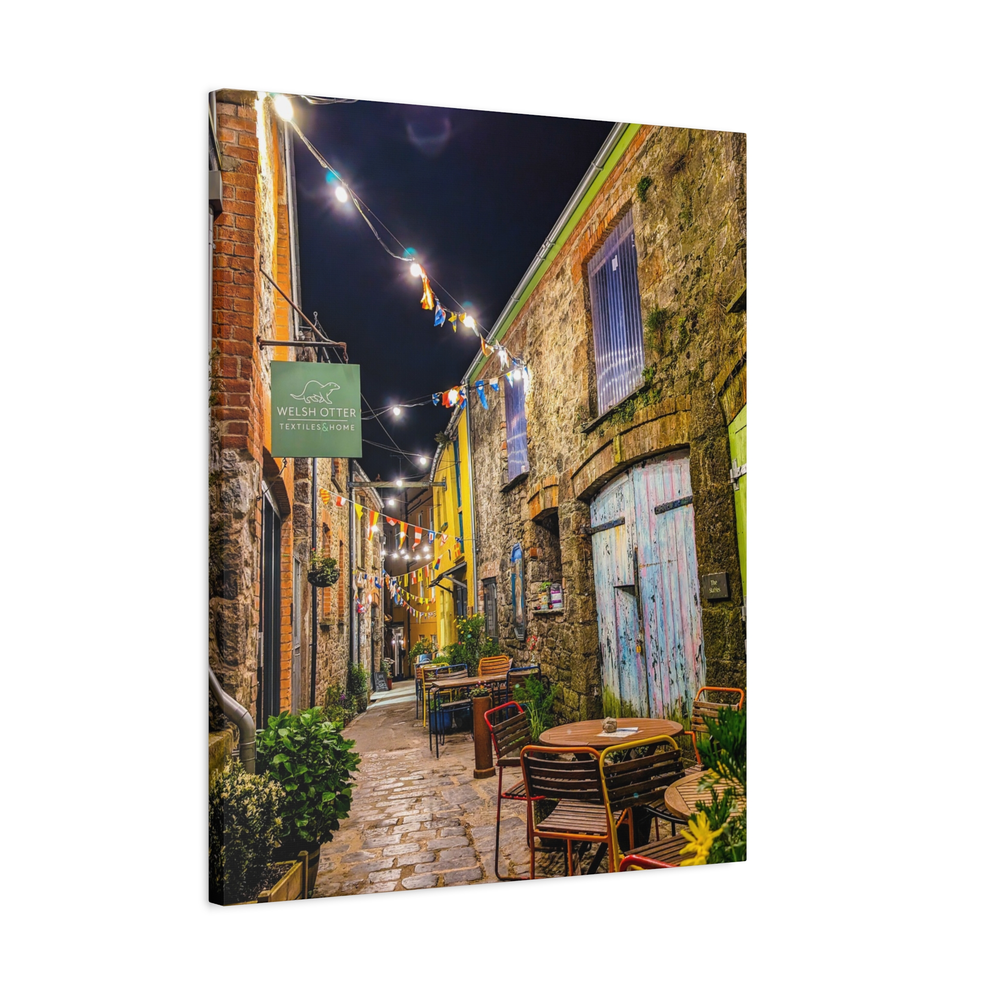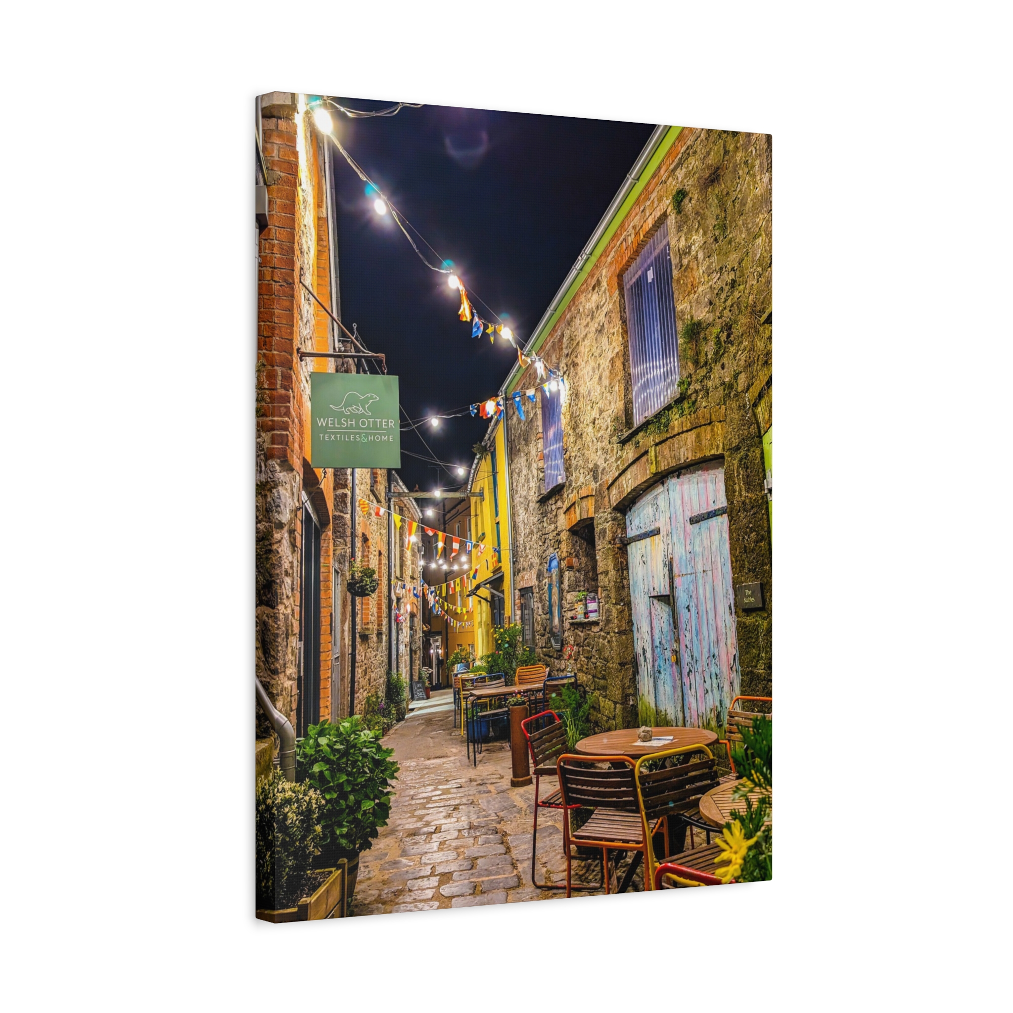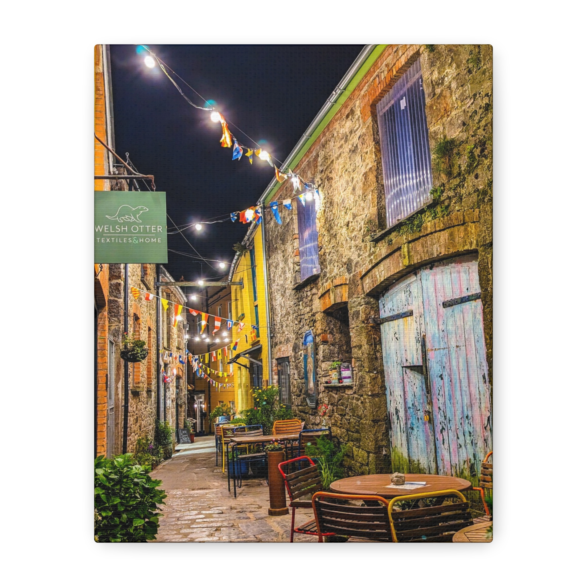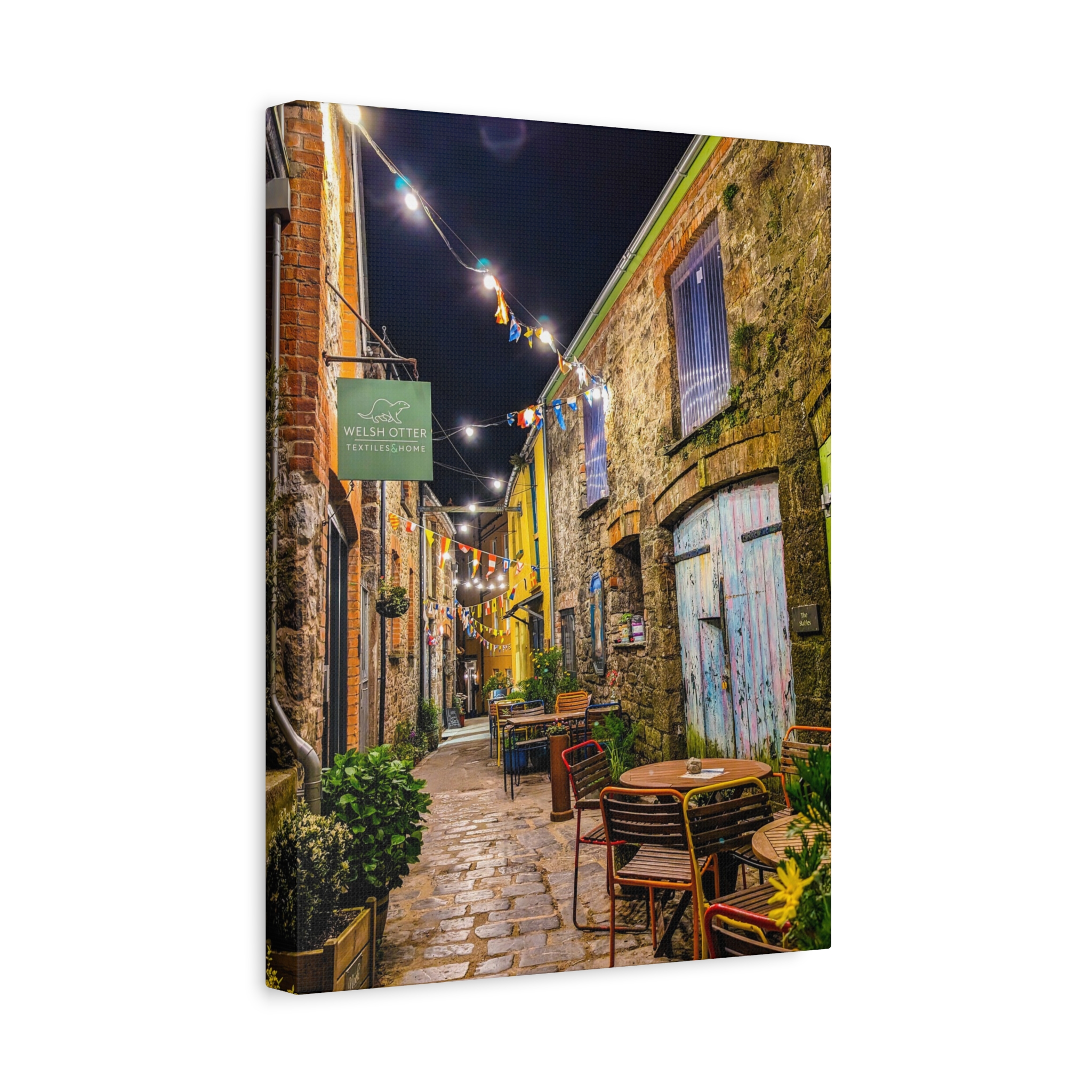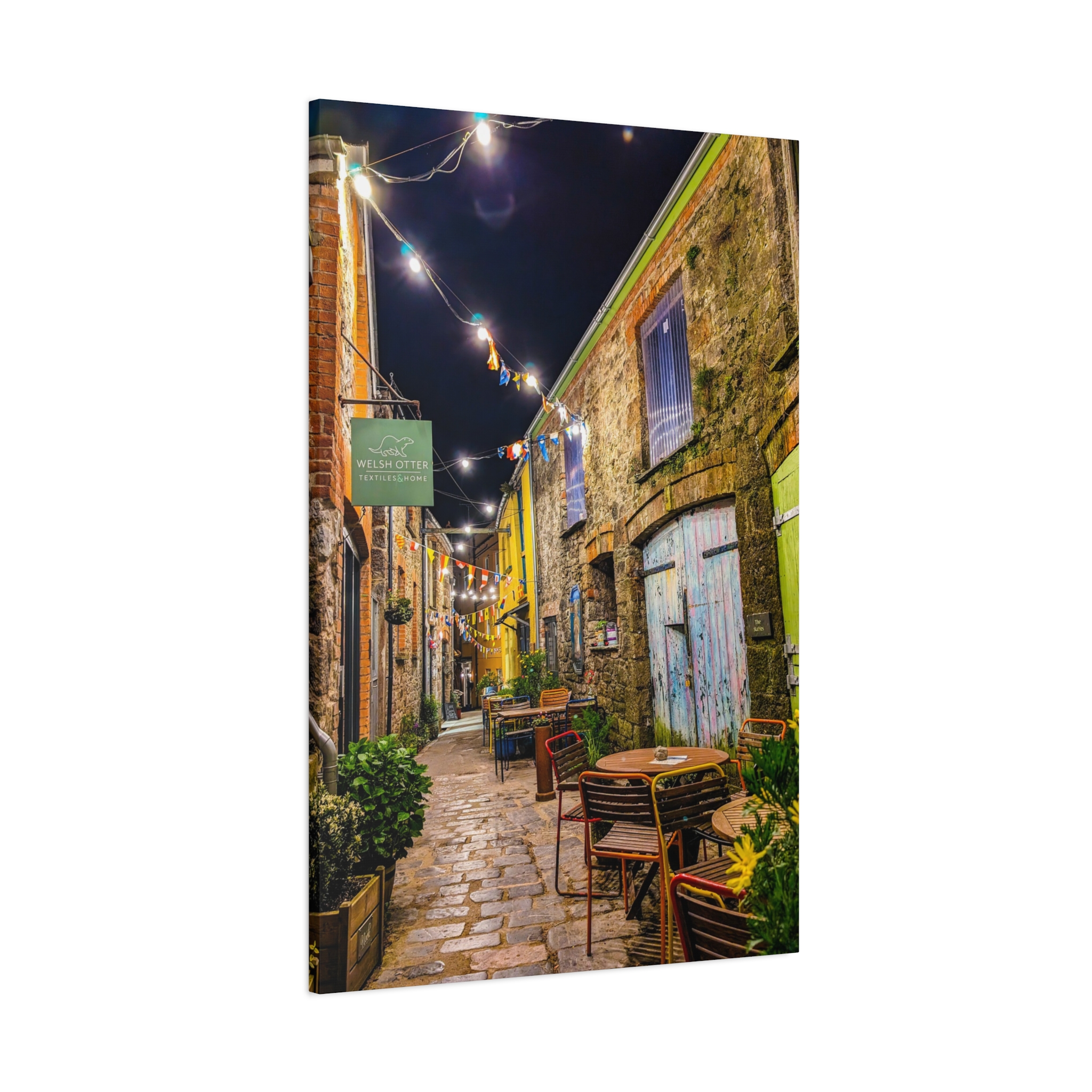Step into the heart of Tenby with this breathtaking canvas print of Sergeant’s Lane, masterfully captured by local artist Lucy Crockford. This vibrant scene, illuminated by twinkling lights and colourful bunting, brings to life the rustic charm of one of Tenby’s most iconic lanes. Perfect for anyone who loves the magic of an evening stroll through Tenby’s winding alleys.