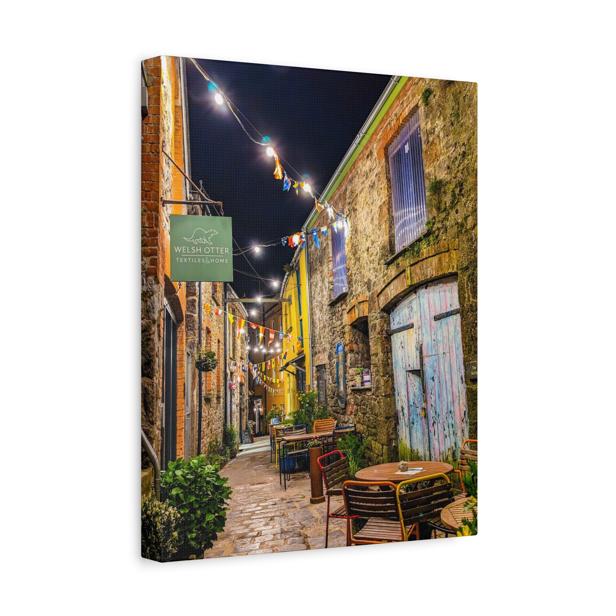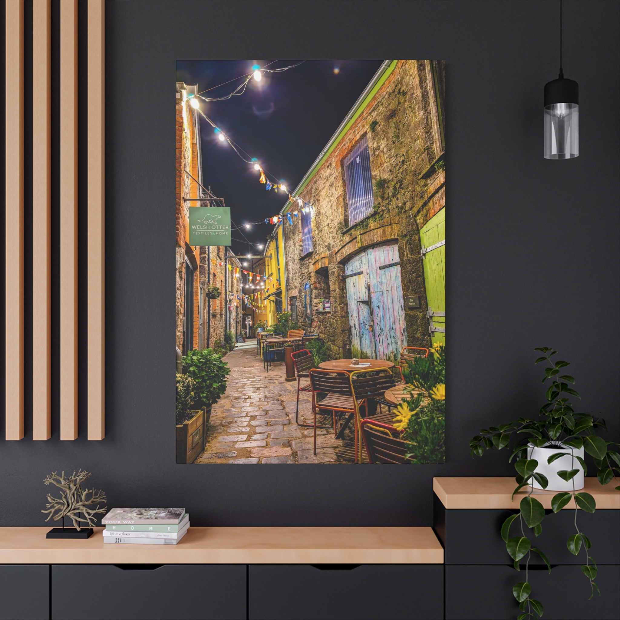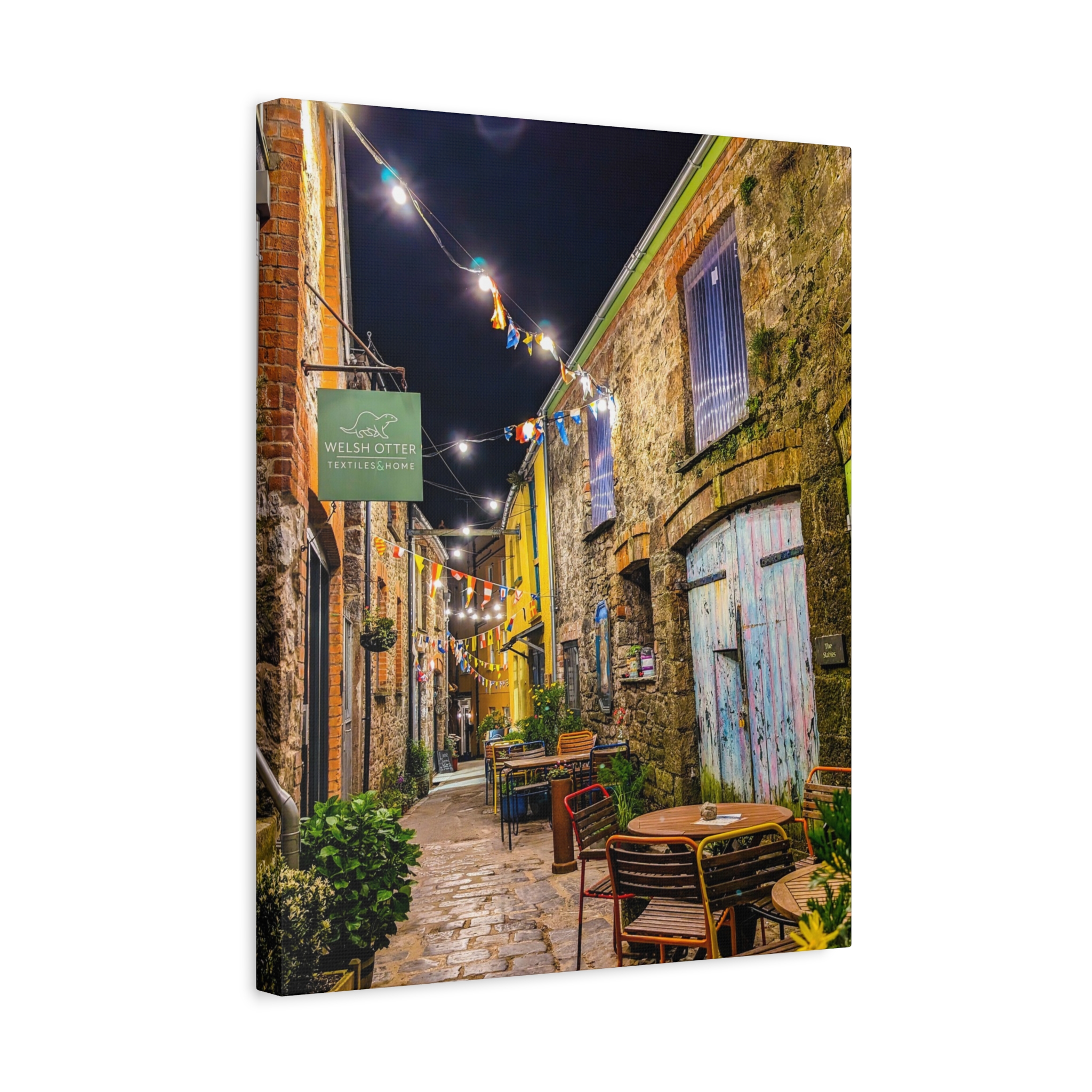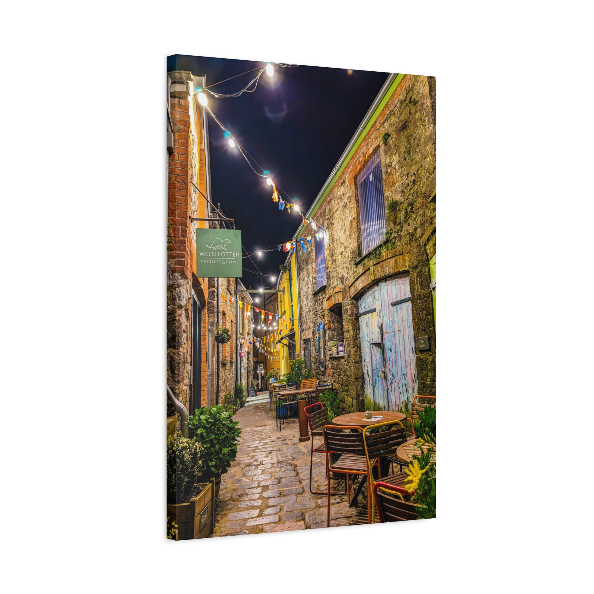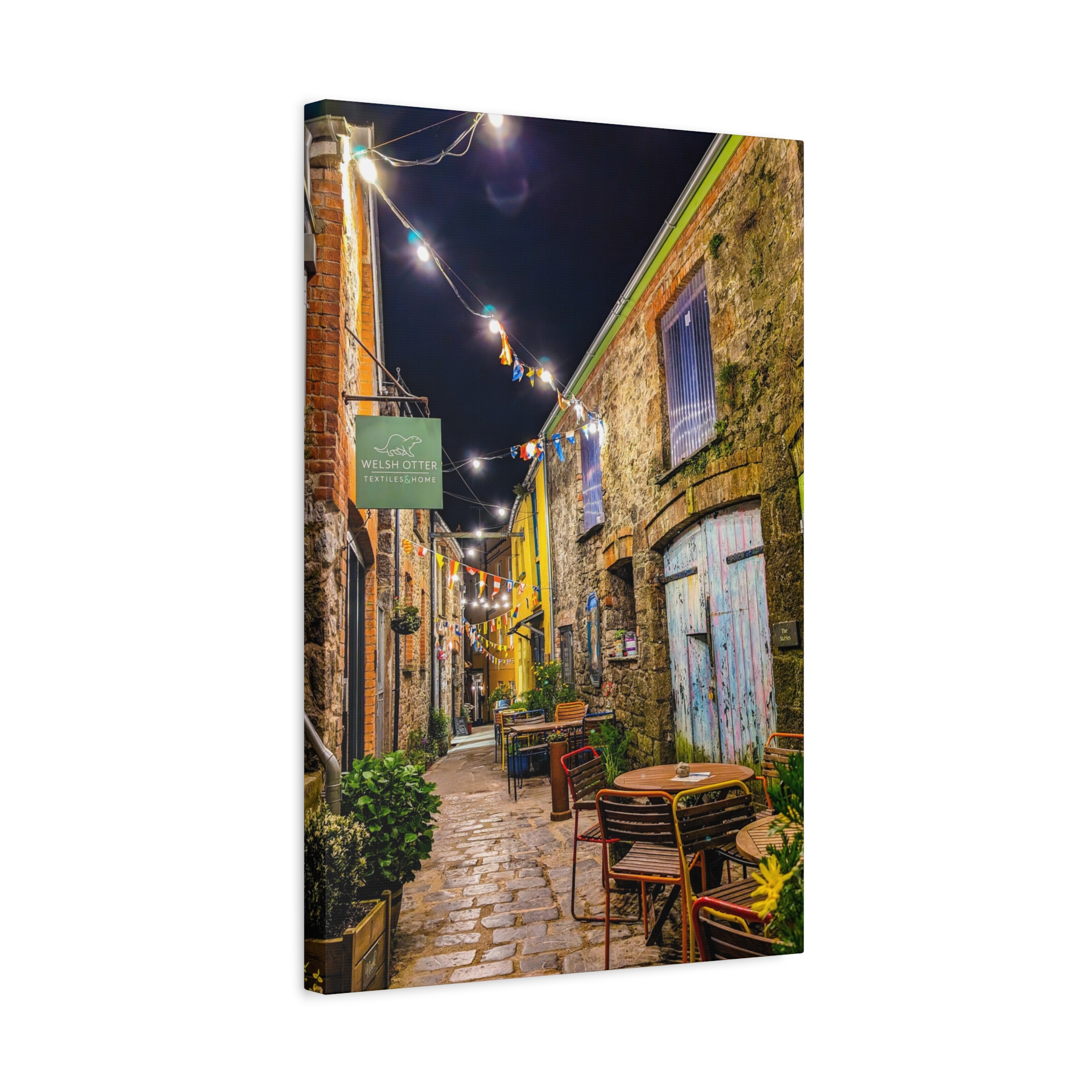 Step into the heart of Tenby with this breathtaking canvas print of Sergeant’s Lane, masterfully captured by local artist Lucy Crockford. This vibrant scene, illuminated by twinkling lights and colourful bunting, brings to life the rustic charm of one of Tenby’s most iconic lanes. Perfect for anyone who loves the magic of an evening stroll through Tenby’s winding alleys.