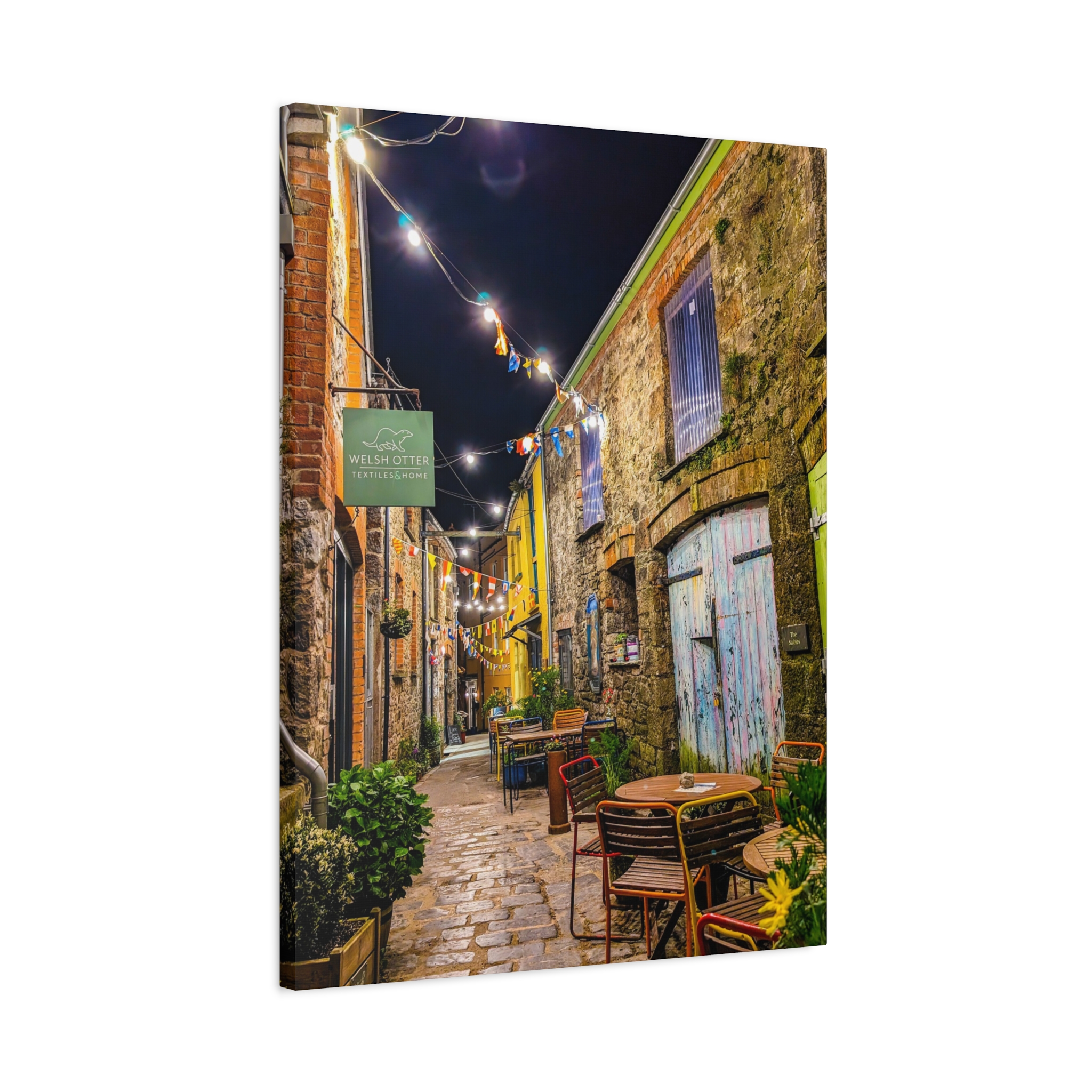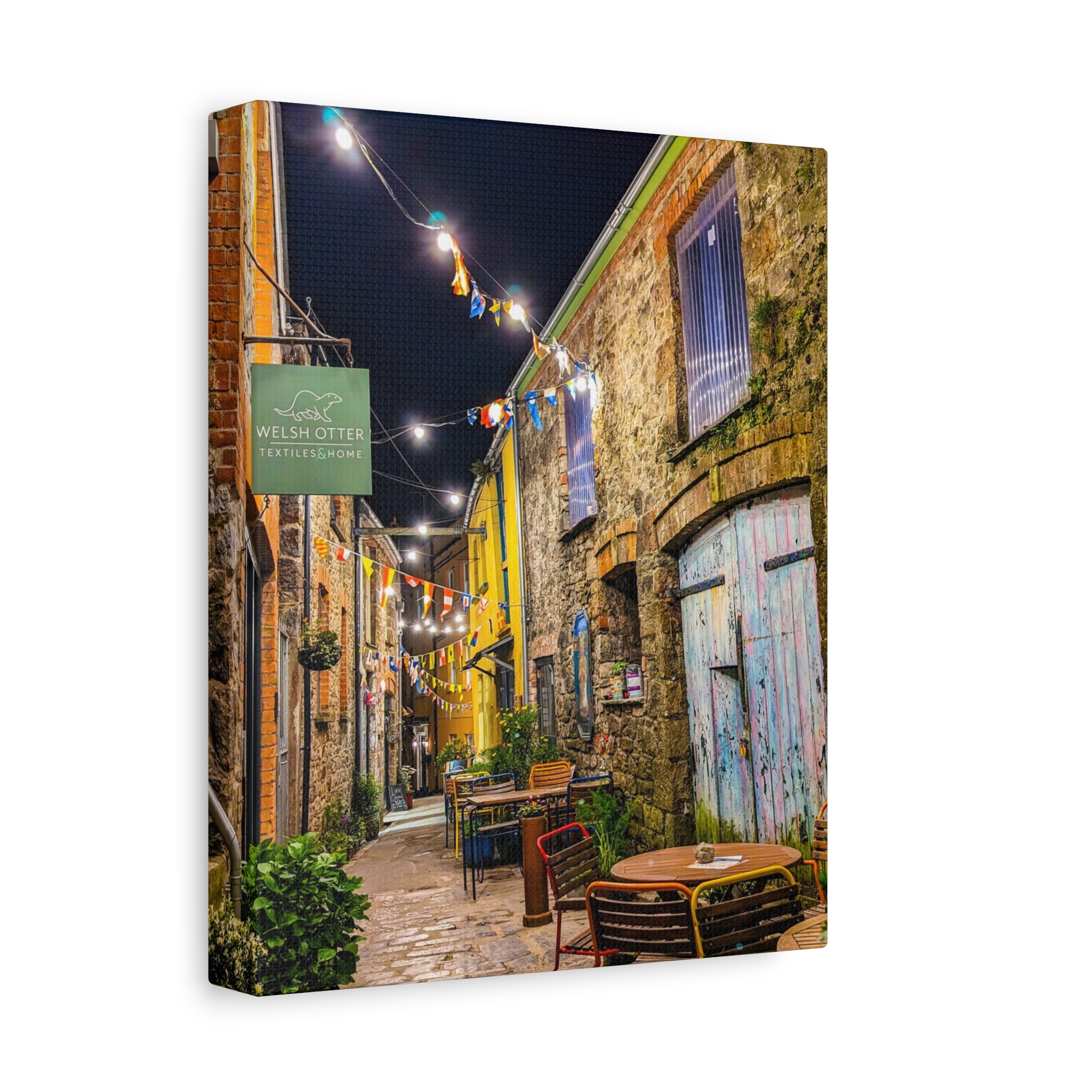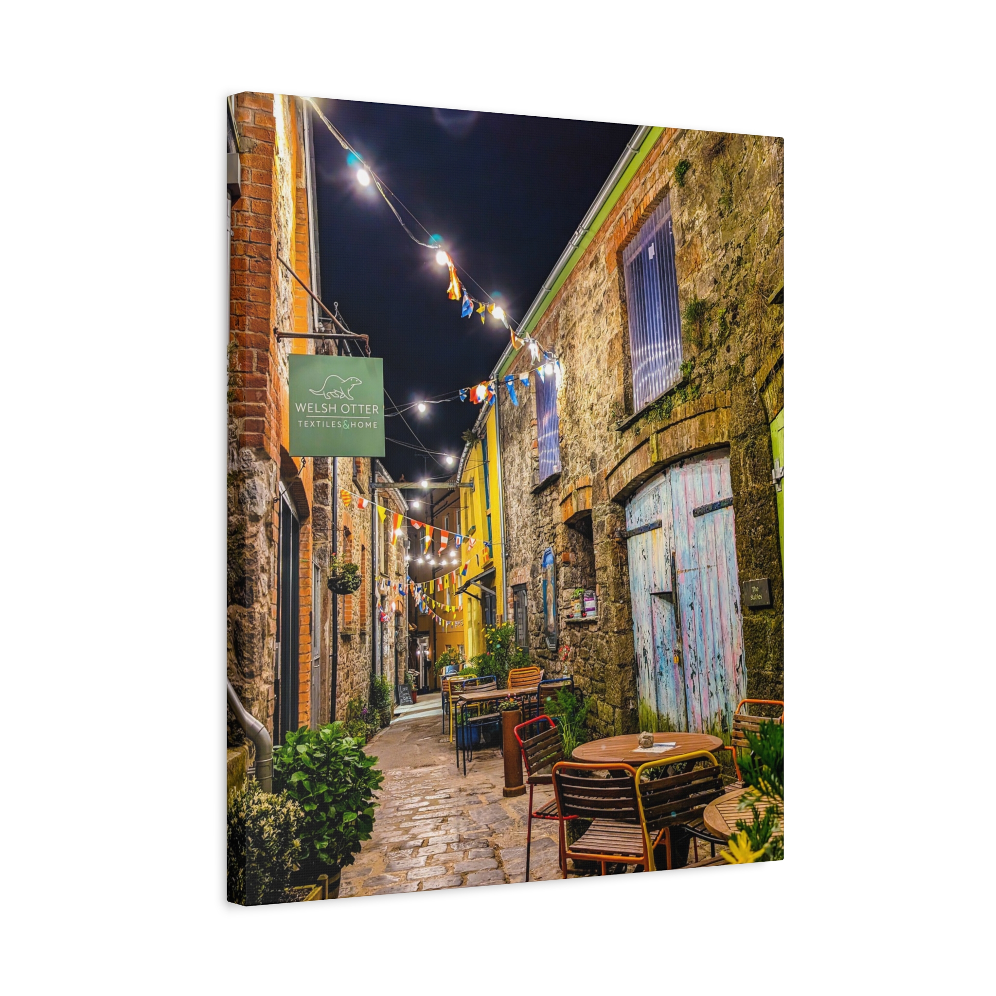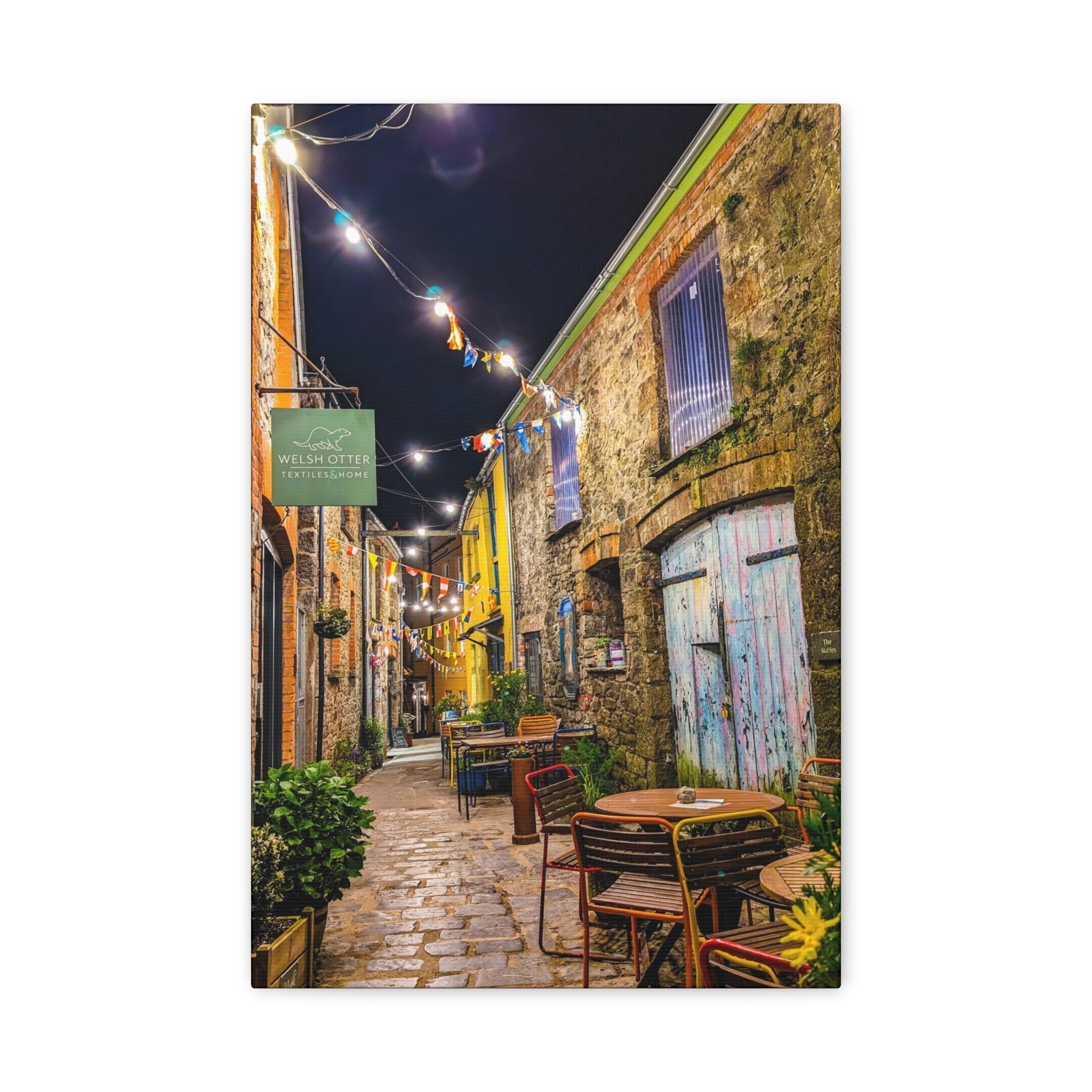 Step into the heart of Tenby with this breathtaking canvas print of Sergeant’s Lane, masterfully captured by local artist Lucy Crockford. This vibrant scene, illuminated by twinkling lights and colourful bunting, brings to life the rustic charm of one of Tenby’s most iconic lanes. Perfect for anyone who loves the magic of an evening stroll through Tenby’s winding alleys.