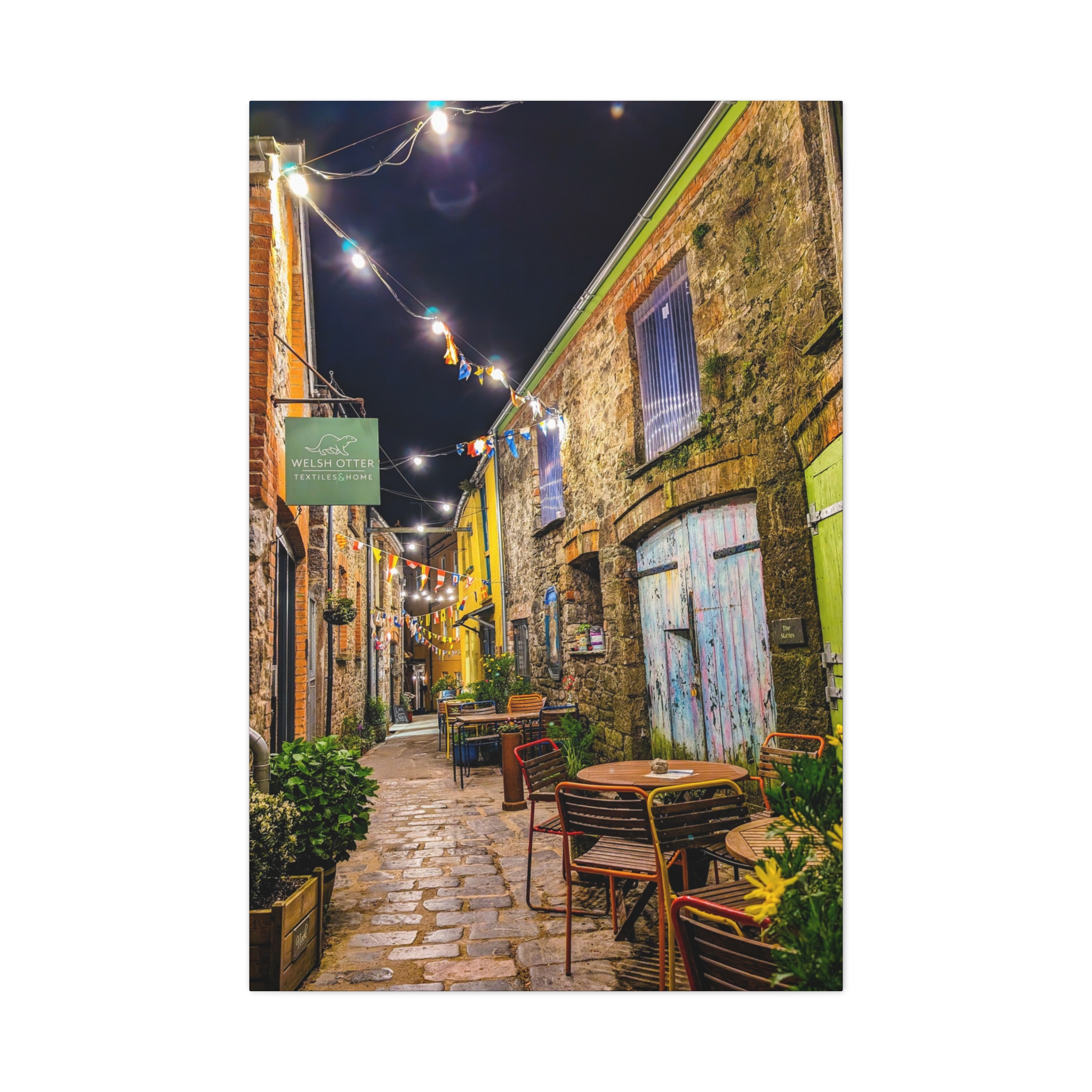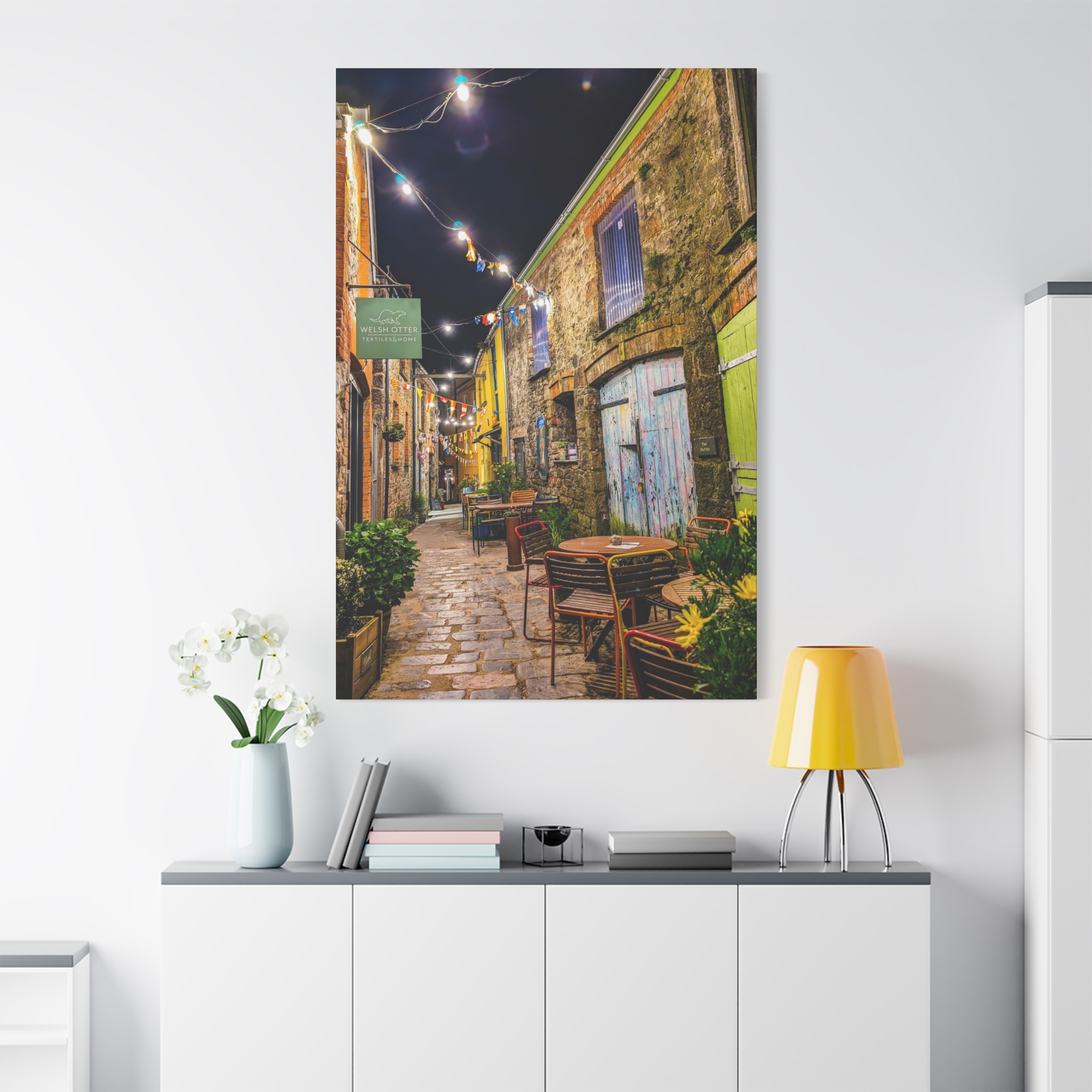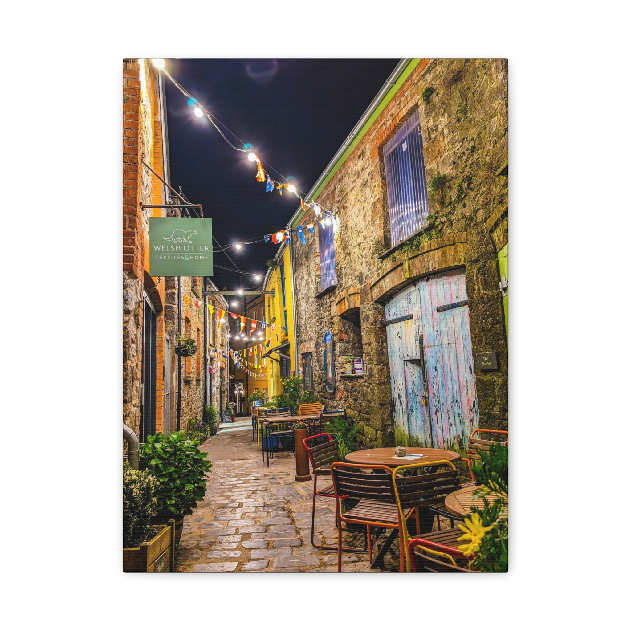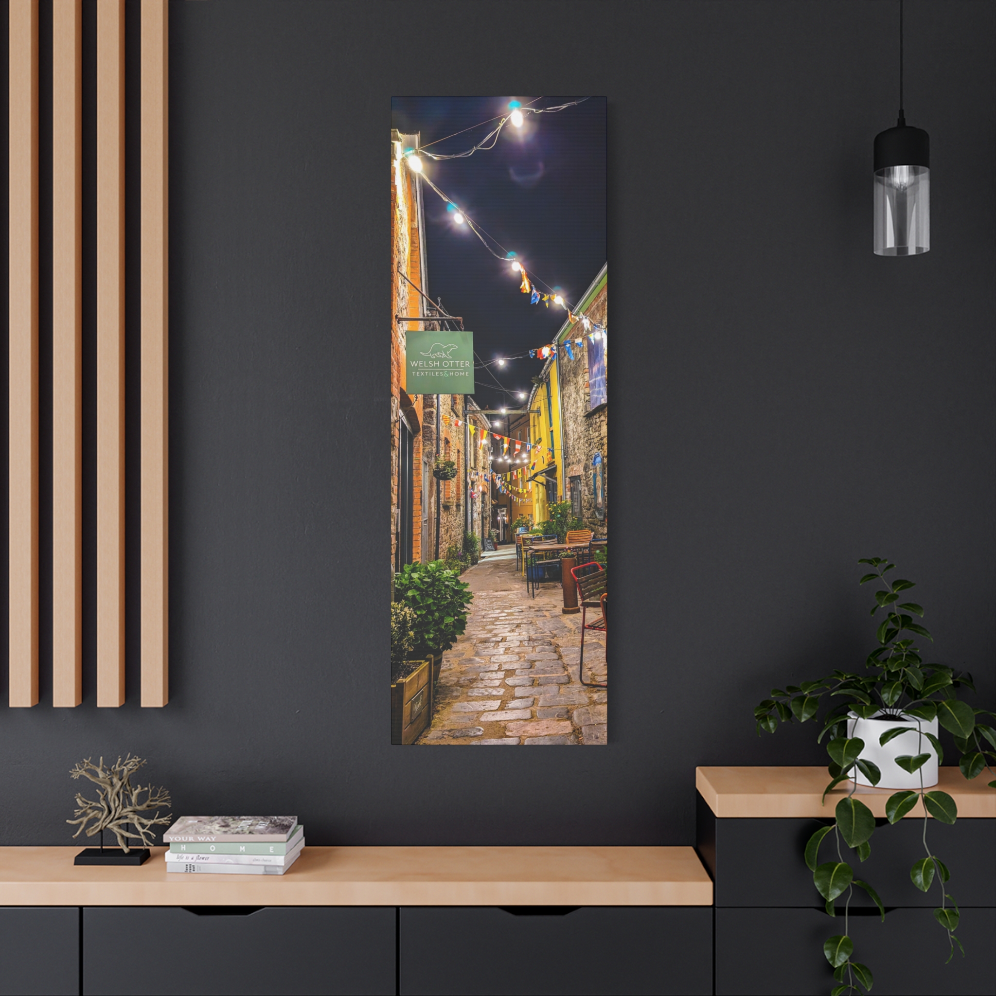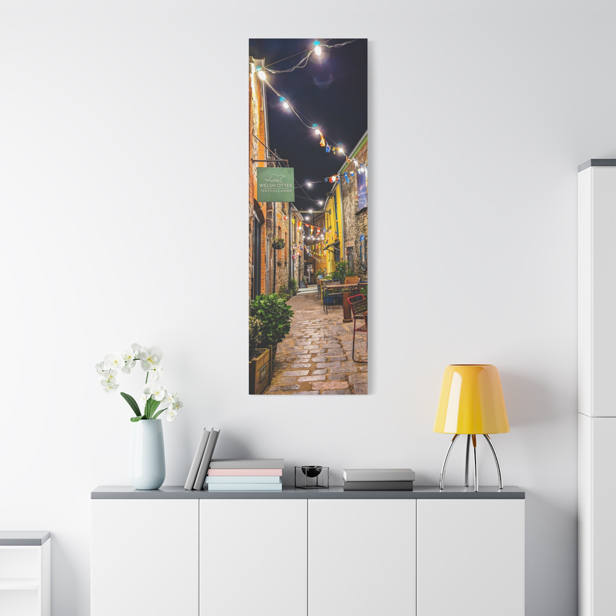 Step into the heart of Tenby with this breathtaking canvas print of Sergeant’s Lane, masterfully captured by local artist Lucy Crockford. This vibrant scene, illuminated by twinkling lights and colourful bunting, brings to life the rustic charm of one of Tenby’s most iconic lanes. Perfect for anyone who loves the magic of an evening stroll through Tenby’s winding alleys.